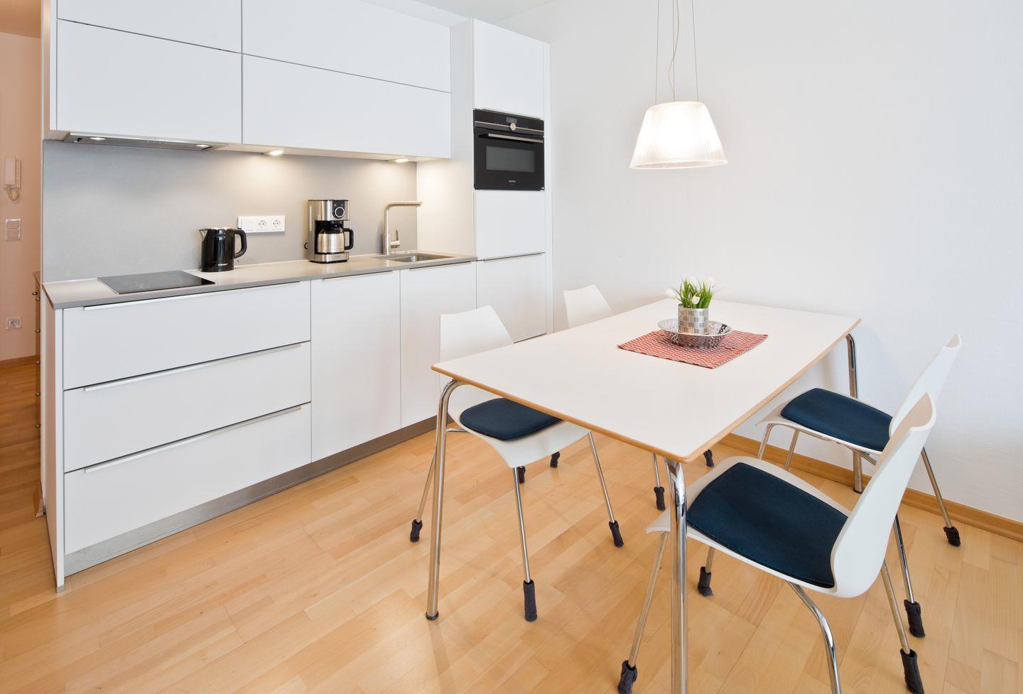 Das helle Wohnzimmer begrüßt Sie mit einem gemütlichen Sofa, einem TV, Radio und einer Sitzgruppe. Hier können Sie entspannte Abende verbringen und sich wohlfühlen. Die offene Küchenzeile bietet Ihnen alle Annehmlichkeiten, darunter einen Herd, Kühlschrank mit Gefrierfach, Kaffeemaschine, Toaster, Eierkocher und eine Mikrowelle mit Grillfunktion. Der Essbereich mit Platz für bis zu vier Personen lädt zum gemeinsamen Genießen von Mahlzeiten ein. Die Grundausstattung an Gläsern, Besteck und Kochutensilien steht Ihnen zur Verfügung.