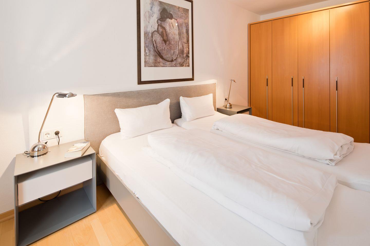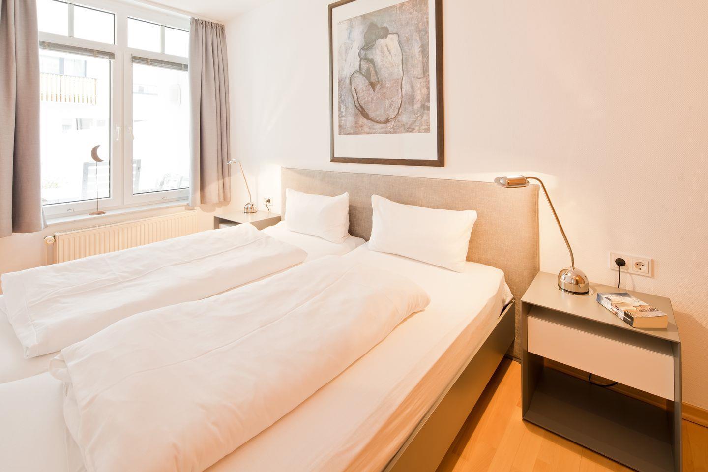 Das separate Schlafzimmer verfügt über ein gemütliches Doppelbett und einen Kleiderschrank. Sichtschutz am Fenster sorgt für angenehme Dunkelheit und erholsame Nächte. Das Duschbad bietet Komfort und ist mit einem Föhn ausgestattet. Handtücher, Bettwäsche und die Endreinigung sind inklusive.