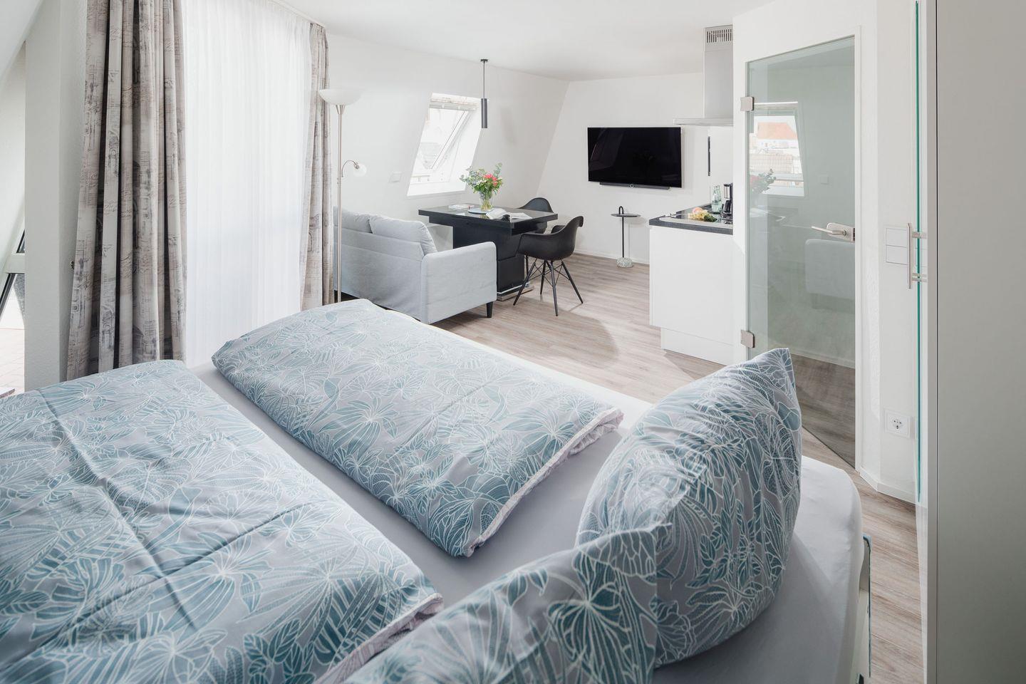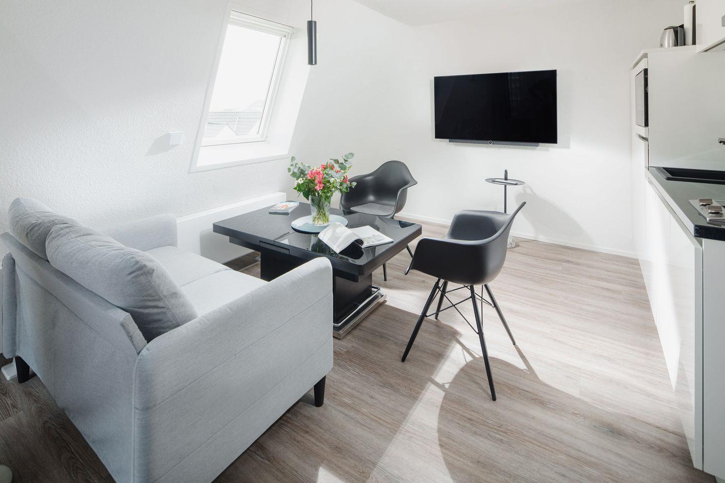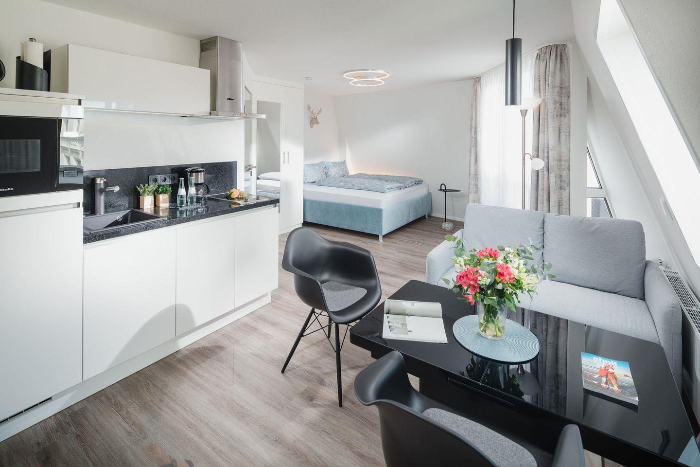 Moderne Luisensuite auf Norderney mit Loggia, hochwertiger Ausstattung und Meerblick, ideal für erholsame Tage zu zweit.