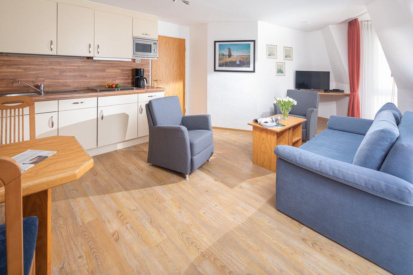 Die Wohnung 9 im Haus "Die Kogge" in der Luisenstraße 17 auf Norderney, befindet sich im 2. Obergeschoss und ist per Fahrstuhl zu erreichen. Sie verfügt über ein separates Schlafzimmer mit Doppelbett, über ein Badezimmer mit WC und Dusche mit flachem Einstieg. Im Wohnraum befindet sich ein neuer Essplatz und eine gute ausgestattete Küche. Weiter gibt es ein Schlafsofa (Liegefläche 160x200), sowei zwei Sessel, kostenfreies WLAN, DVD-Player und Flachbild TV.