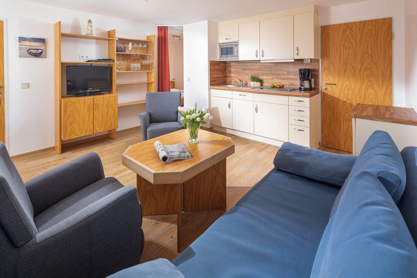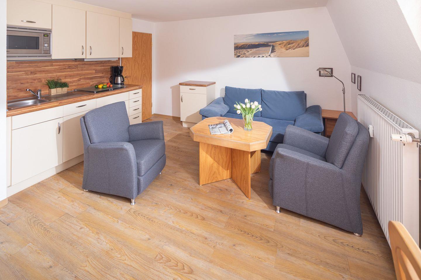 Der Wohnraum wurde geschmackvoll gestaltet und lädt zum Verweilen ein. Hier finden Sie einen Essplatz für gemeinsame Mahlzeiten sowie eine gut ausgestattete Küche, die Ihnen die Möglichkeit bietet, sich selbst zu versorgen. Der Wohnbereich verfügt über ein komfortables Sofa sowie zwei Sessel, die zum Entspannen einladen. Für Unterhaltung sorgen kostenfreies WLAN, ein DVD-Player und ein Flachbild-TV.