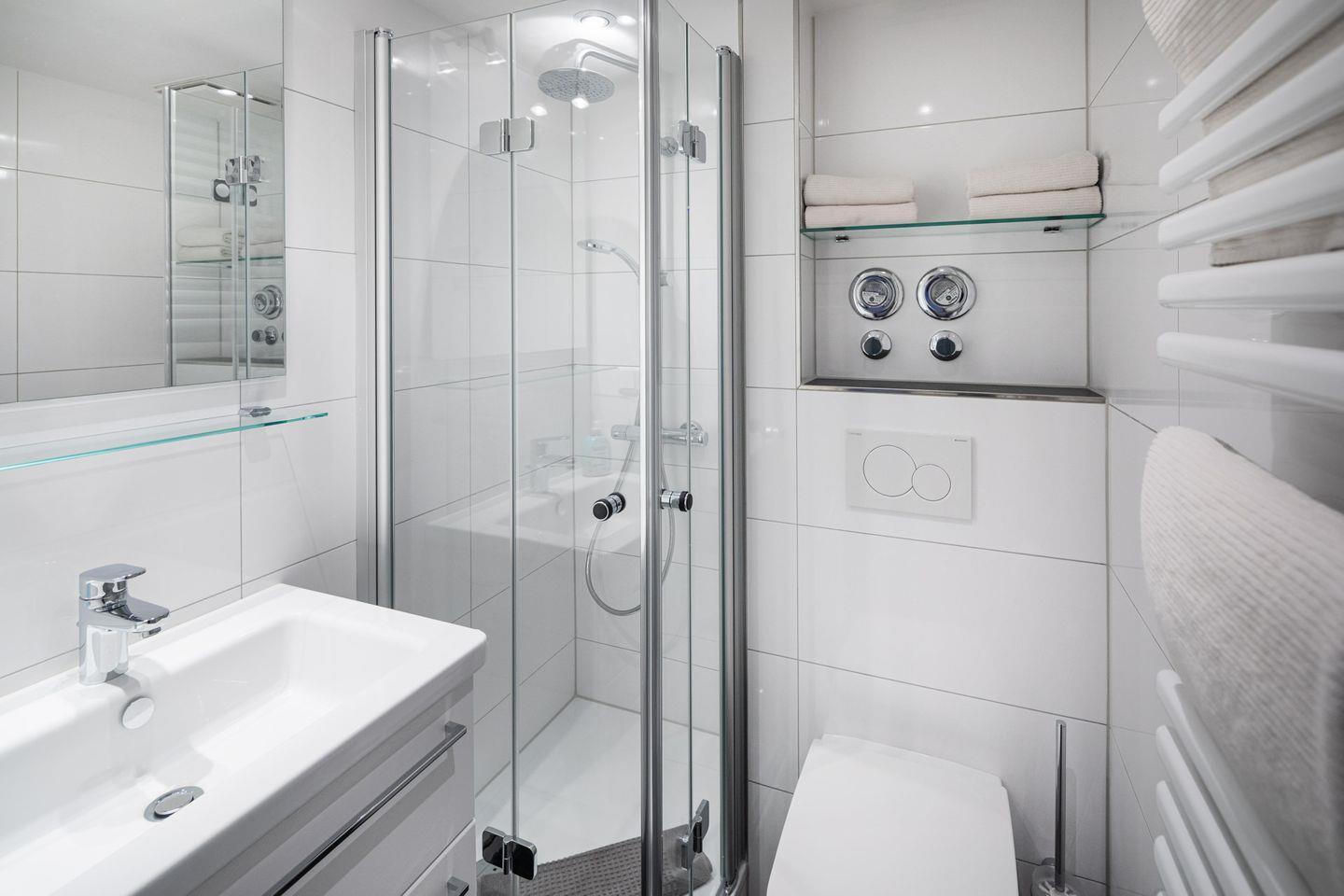 Diese geräumige Ferienunterkunft präsentiert sich mit zwei separaten Schlafzimmern, die ideale Rückzugsorte für erholsame Nächte bieten. In einem der Schlafzimmer erwartet Sie ein gemütliches Doppelbett, während das andere mit zwei Einzelbetten ausgestattet ist. Das Badezimmer überzeugt mit moderner Ausstattung, darunter eine Dusche mit flachem Einstieg sowie WC.