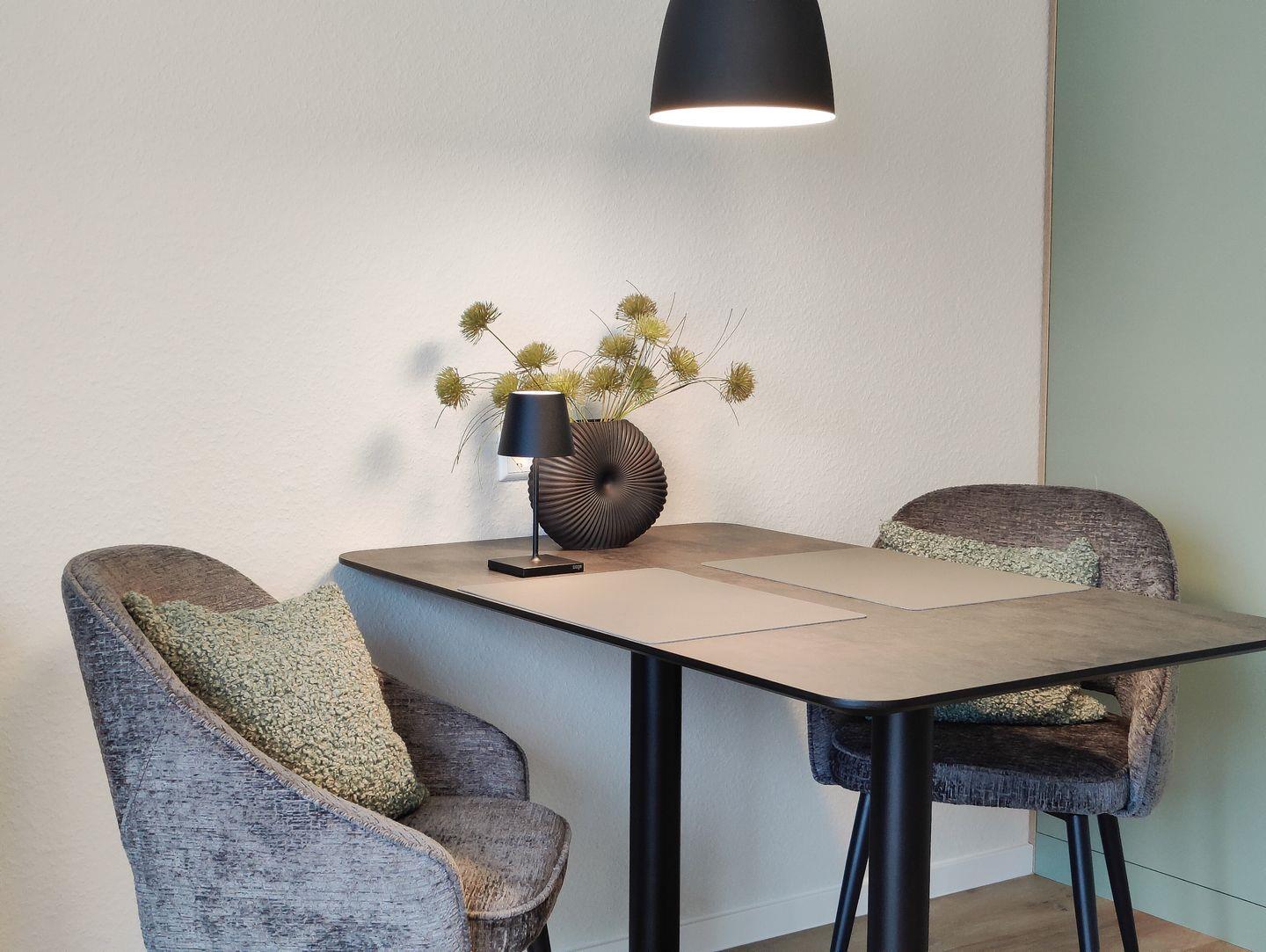 Das Herzstück der Wohnung bildet der offene Wohn- und Schlafbereich mit einem komfortablen Boxspringbett für erholsame Nächte. Zwei gemütliche Sessels laden zum Entspannen ein. Die brandneue Küche ist komplett ausgestattet und bietet alles, was Sie für Ihre kulinarischen Bedürfnisse benötigen. Der hochwertige Boden und das geschmackvolle neue Inventar verleihen der Wohnung eine einladende und stilvolle Atmosphäre.