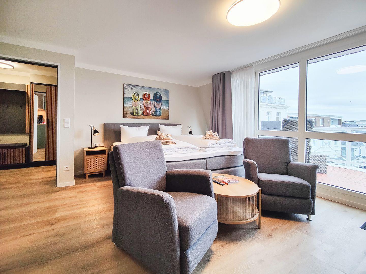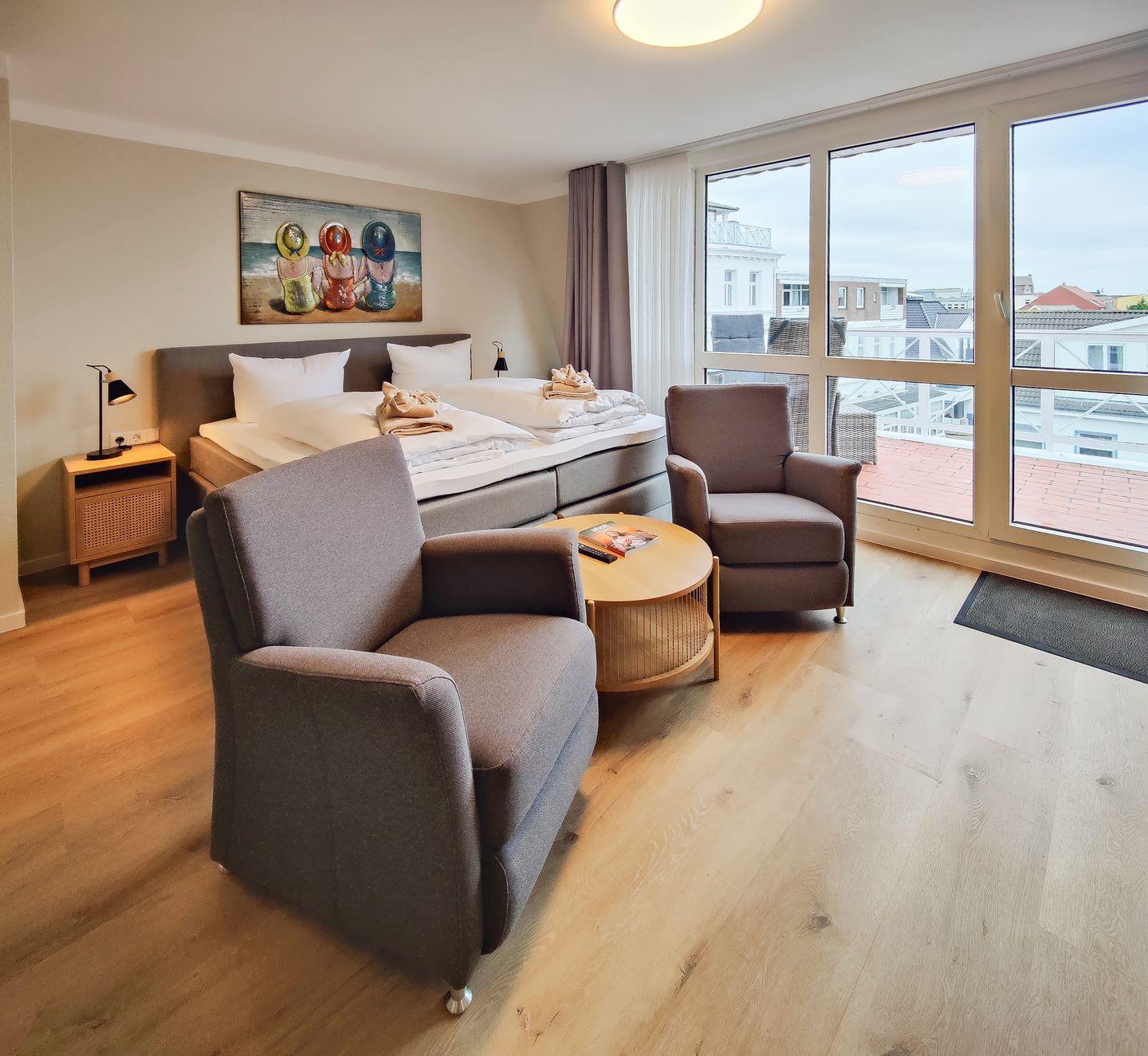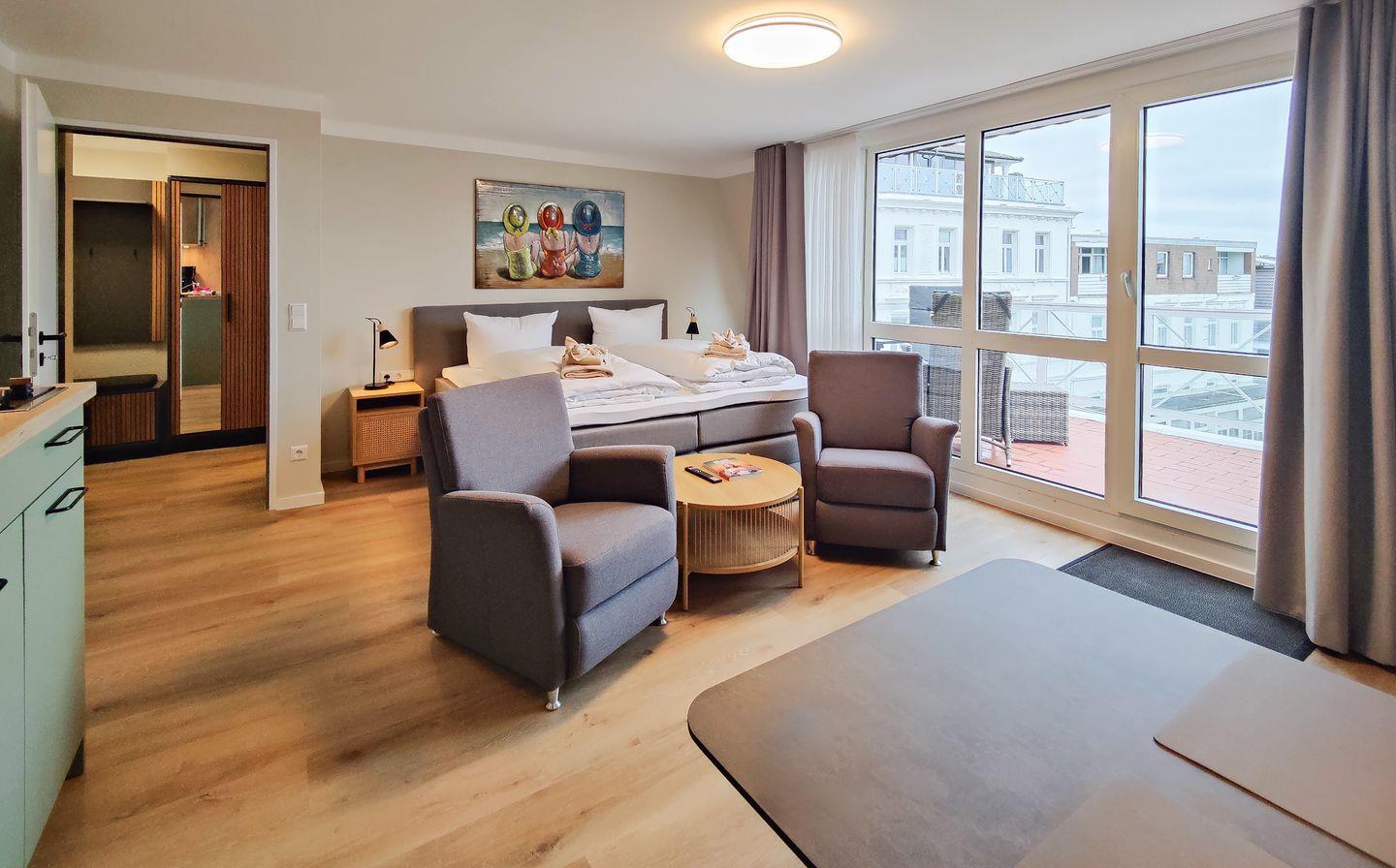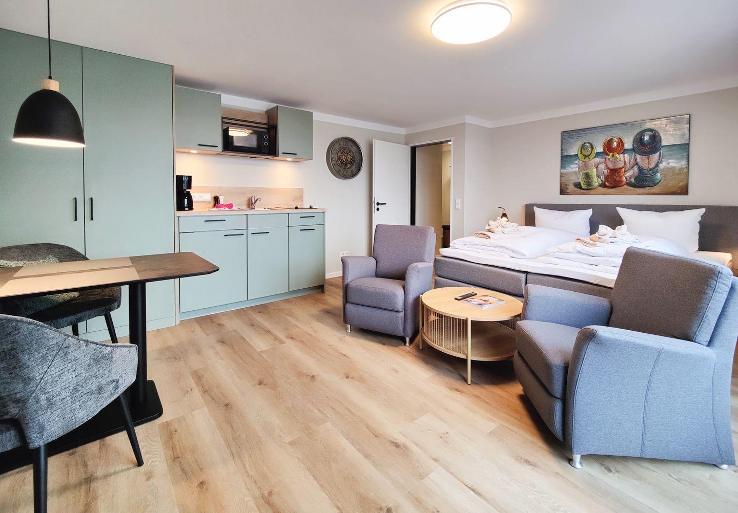 Modern renovierte Einraumwohnung mit Balkon und Meerblick auf Norderney, ideal für einen entspannten Inselurlaub.