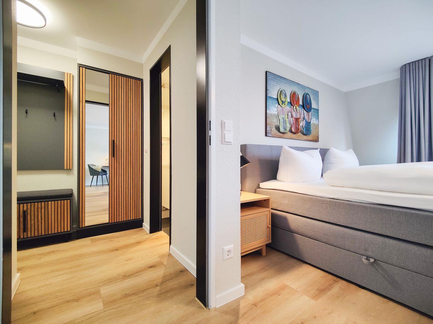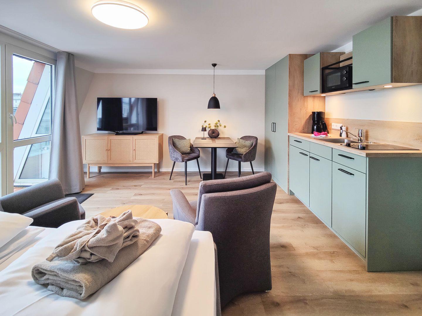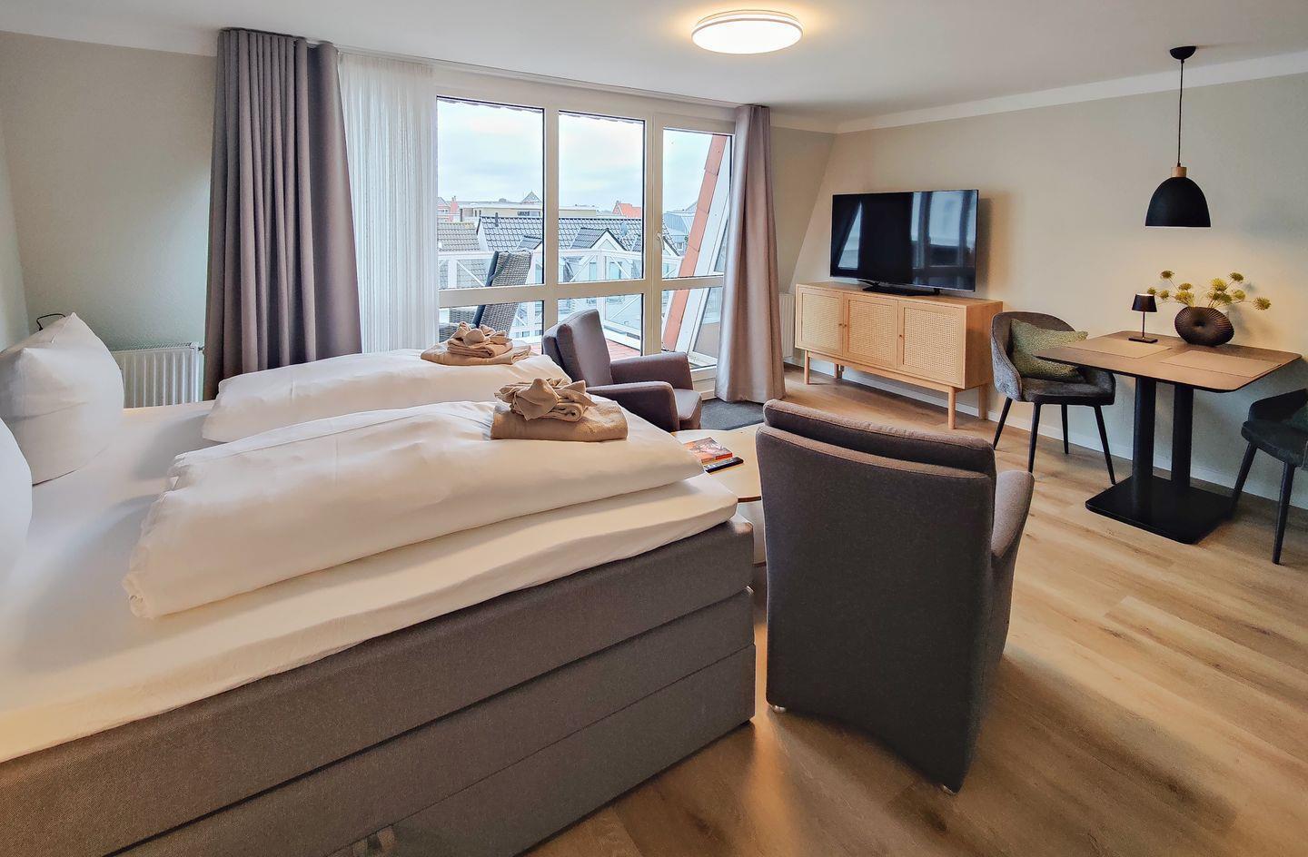Modern renovierte Einraumwohnung mit Balkon und Meerblick auf Norderney, ideal für einen entspannten Inselurlaub.