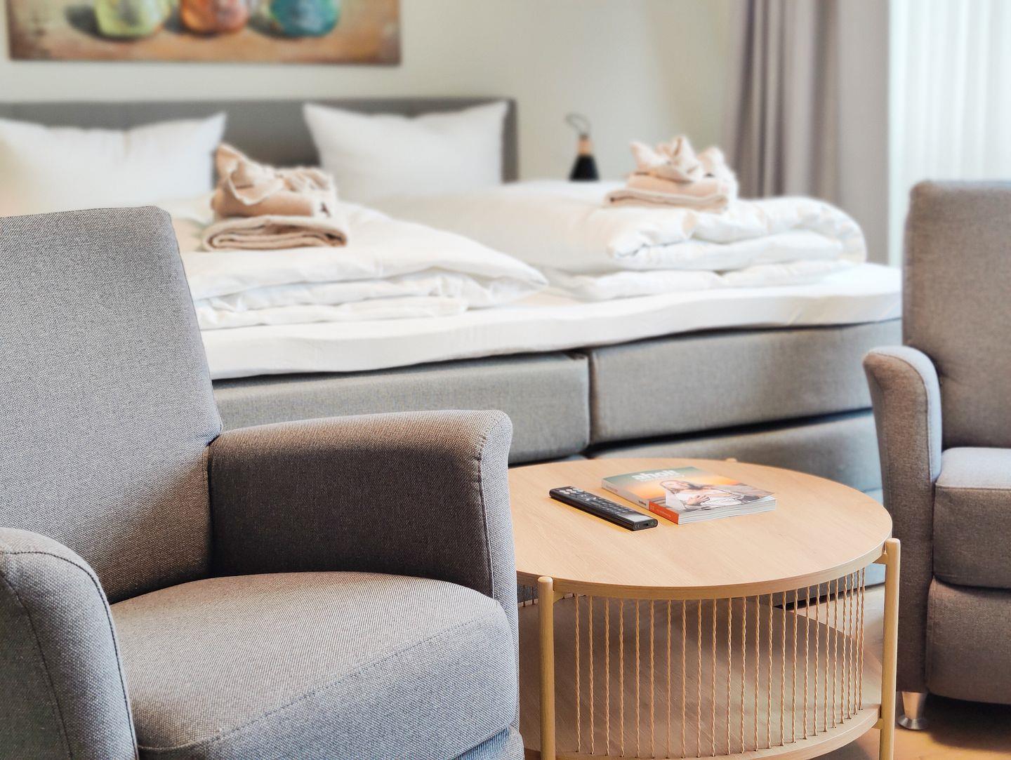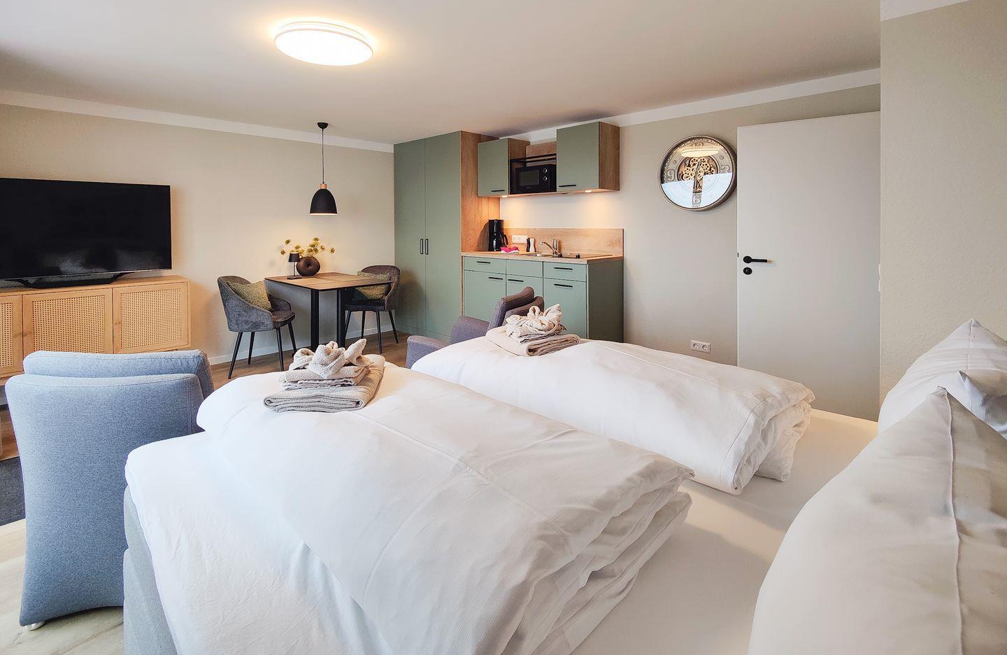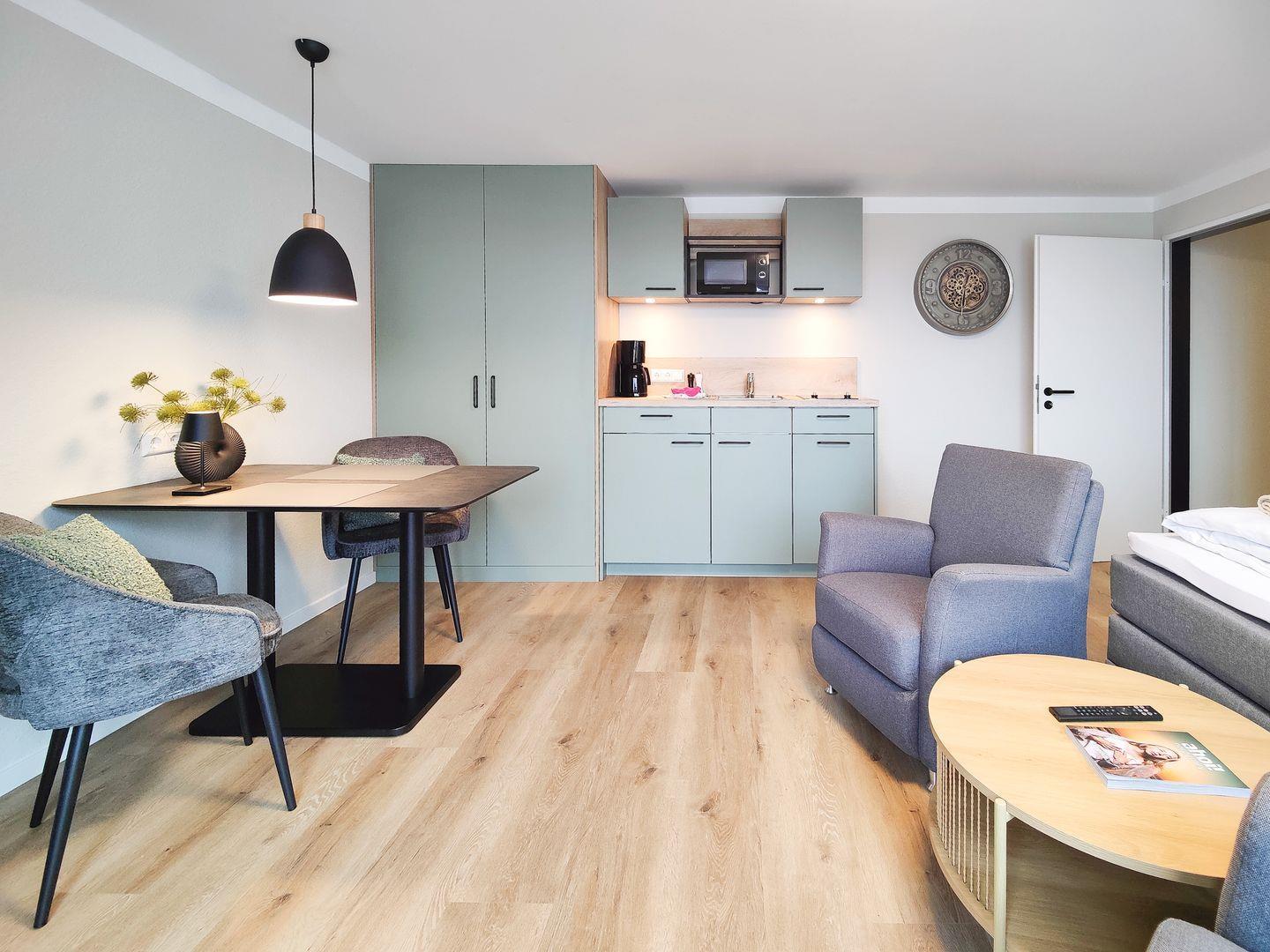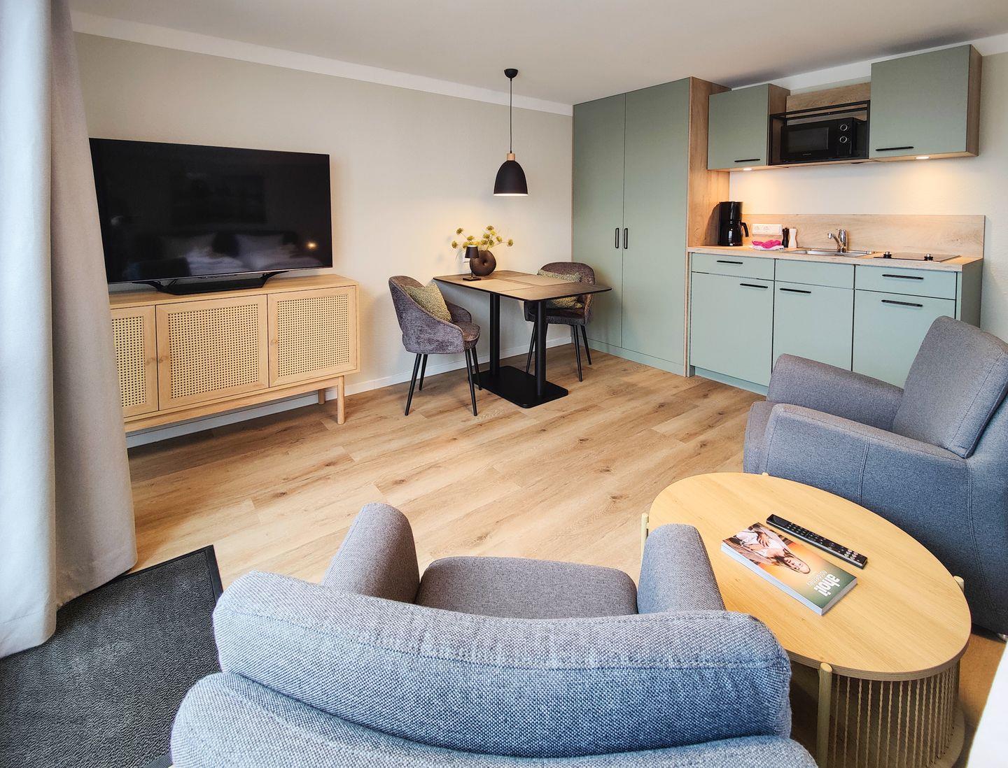 Modern renovierte Einraumwohnung mit Balkon und Meerblick auf Norderney, ideal für einen entspannten Inselurlaub.
