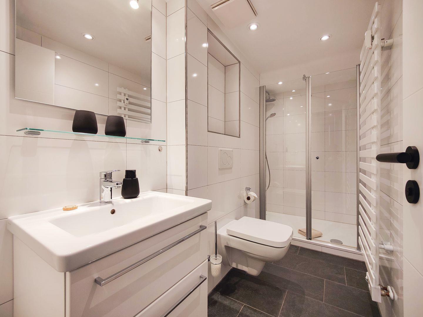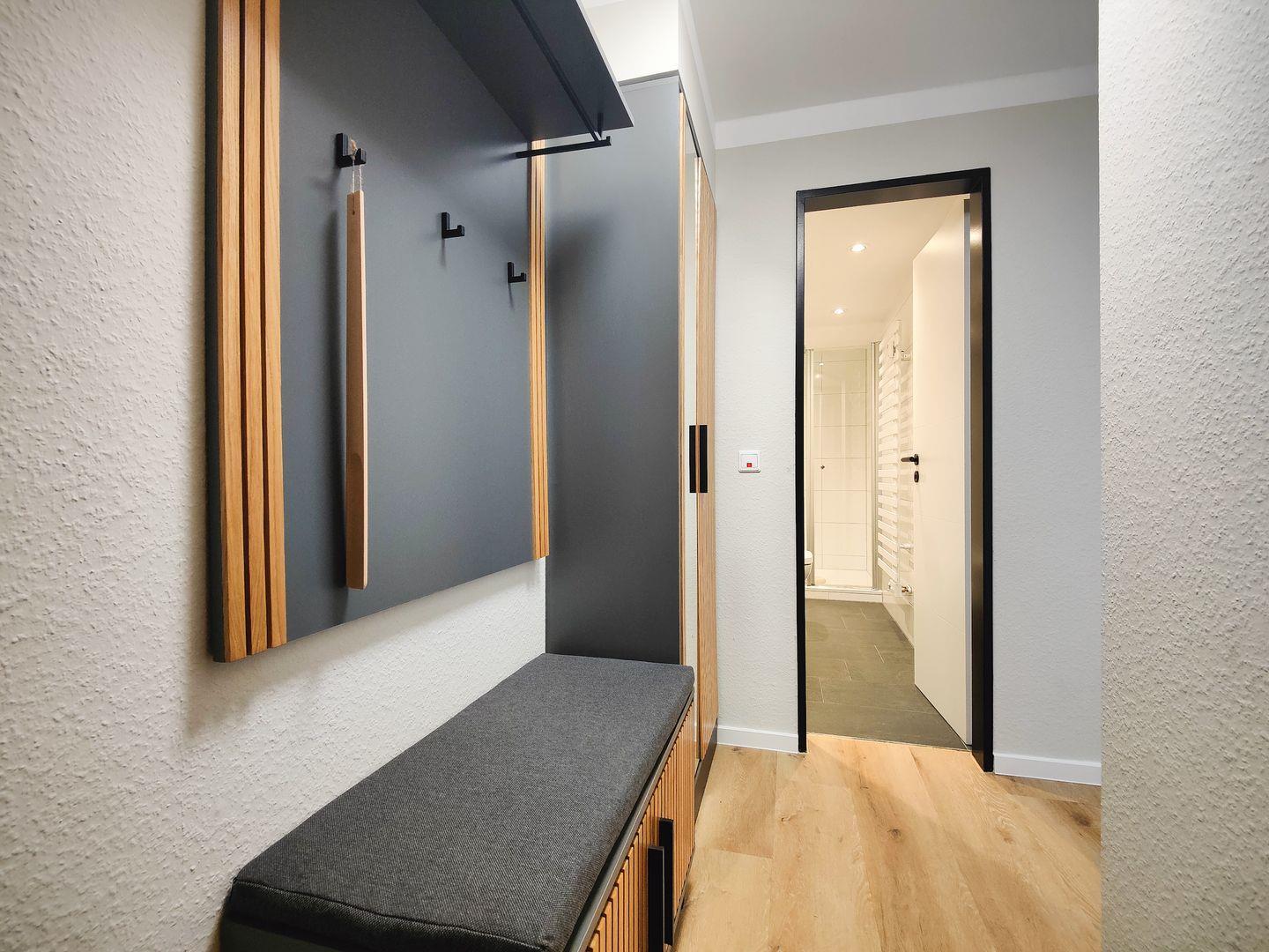 Vom Flur aus gelangen Sie in das moderne Badezimmer mit einer ebenerdigen Dusche, einem Waschbecken mit Unterschrank, WC und Handtuchheizkörper – hier wurde an alles gedacht, um Ihren Aufenthalt so angenehm wie möglich zu gestalten.