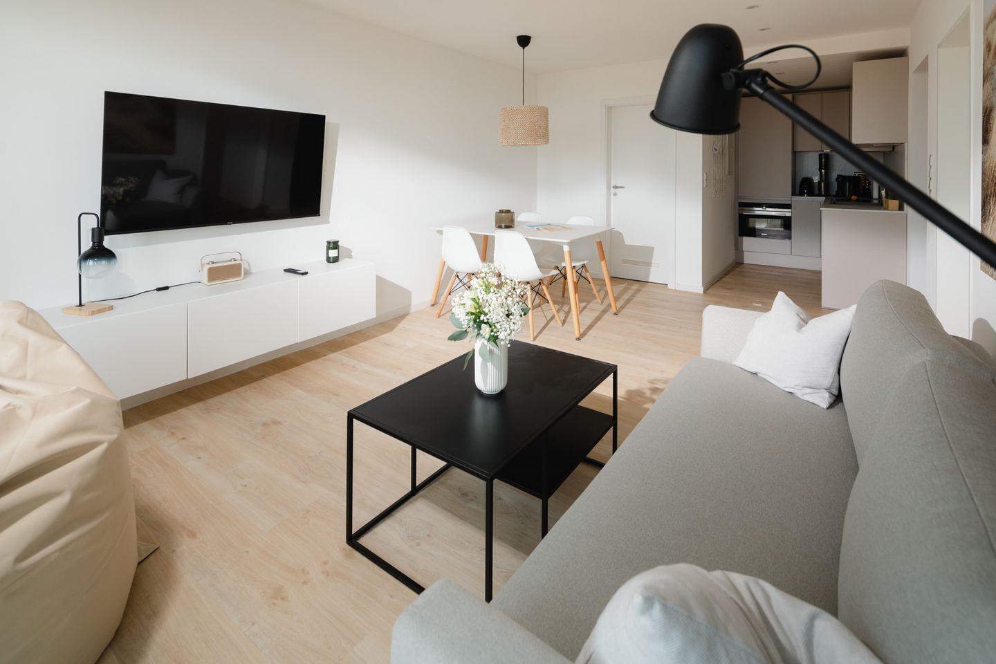 Die Wohnung Nr. 70 wurde 2022 grundsaniert und mit hochwertigen Möbeln ausgestattet. Sie bietet ein separates Schlafzimmer mit einem Doppelbett und eine Schlafcouch im Wohnzimmer, die eine zusätzliche Schlafgelegenheit für eine getrennt schlafende Person bietet. Die kleine Küchenzeile ist voll ausgestattet und das Bad verfügt über eine Dusche und ein WC. Zudem verfügt die Wohnung über einen Balkon mit seitlichem Blick auf das Meer.