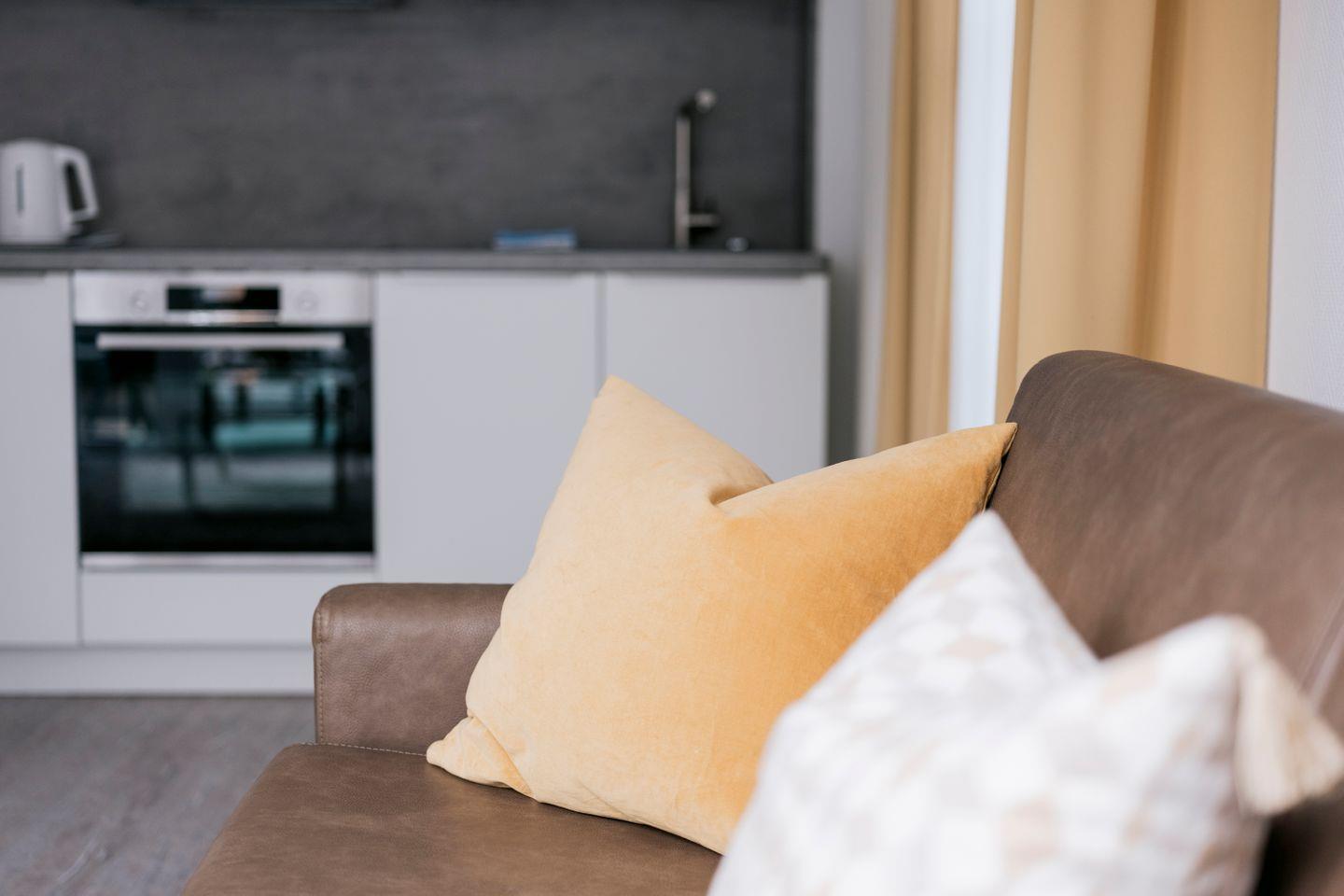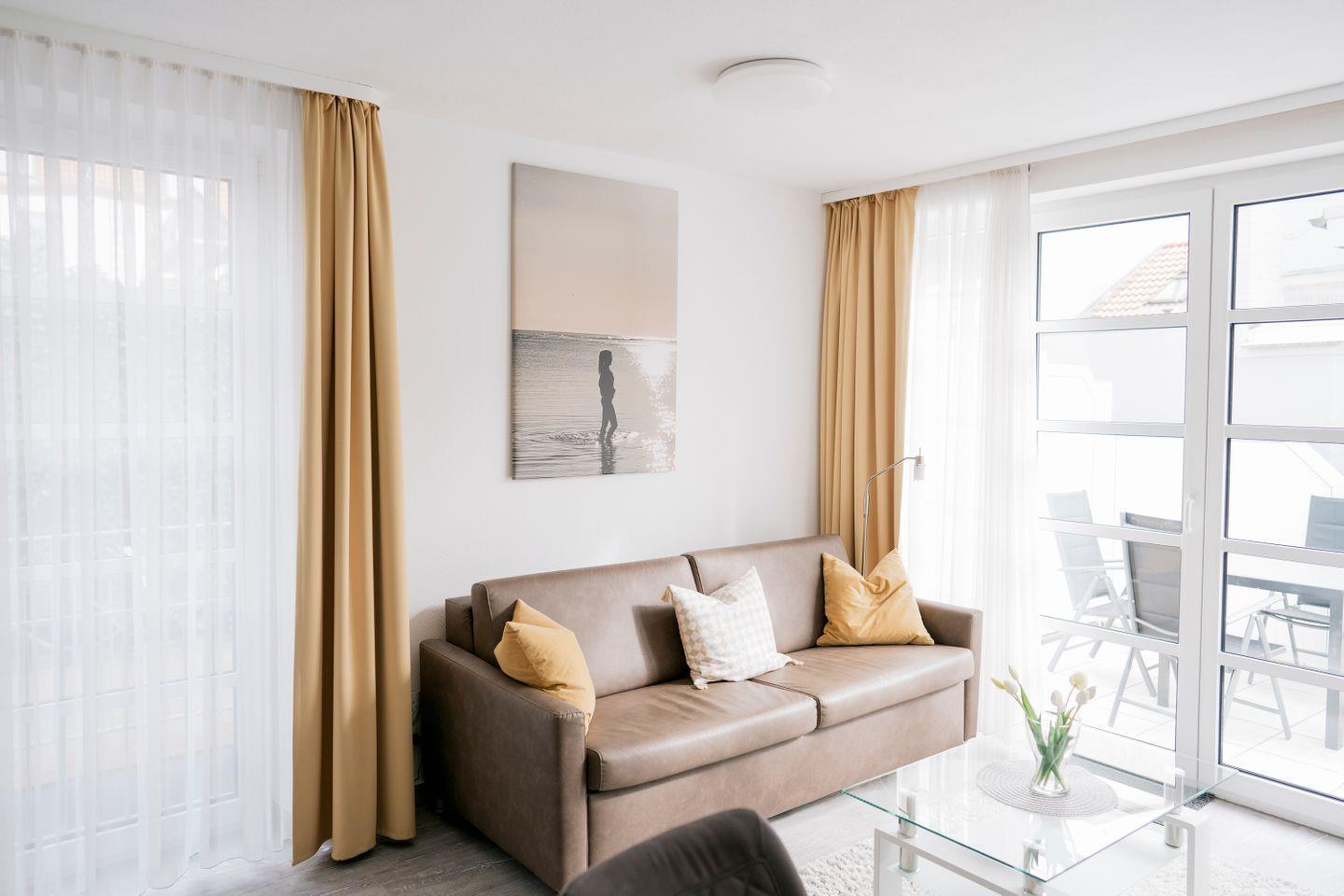 Im freundlich gestalteten Wohnraum befindet sich ein gemütliches Sofa, das für die Nacht zum Bett umfunktioniert werden kann.