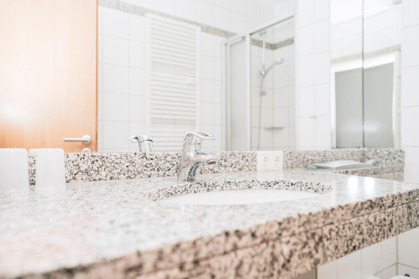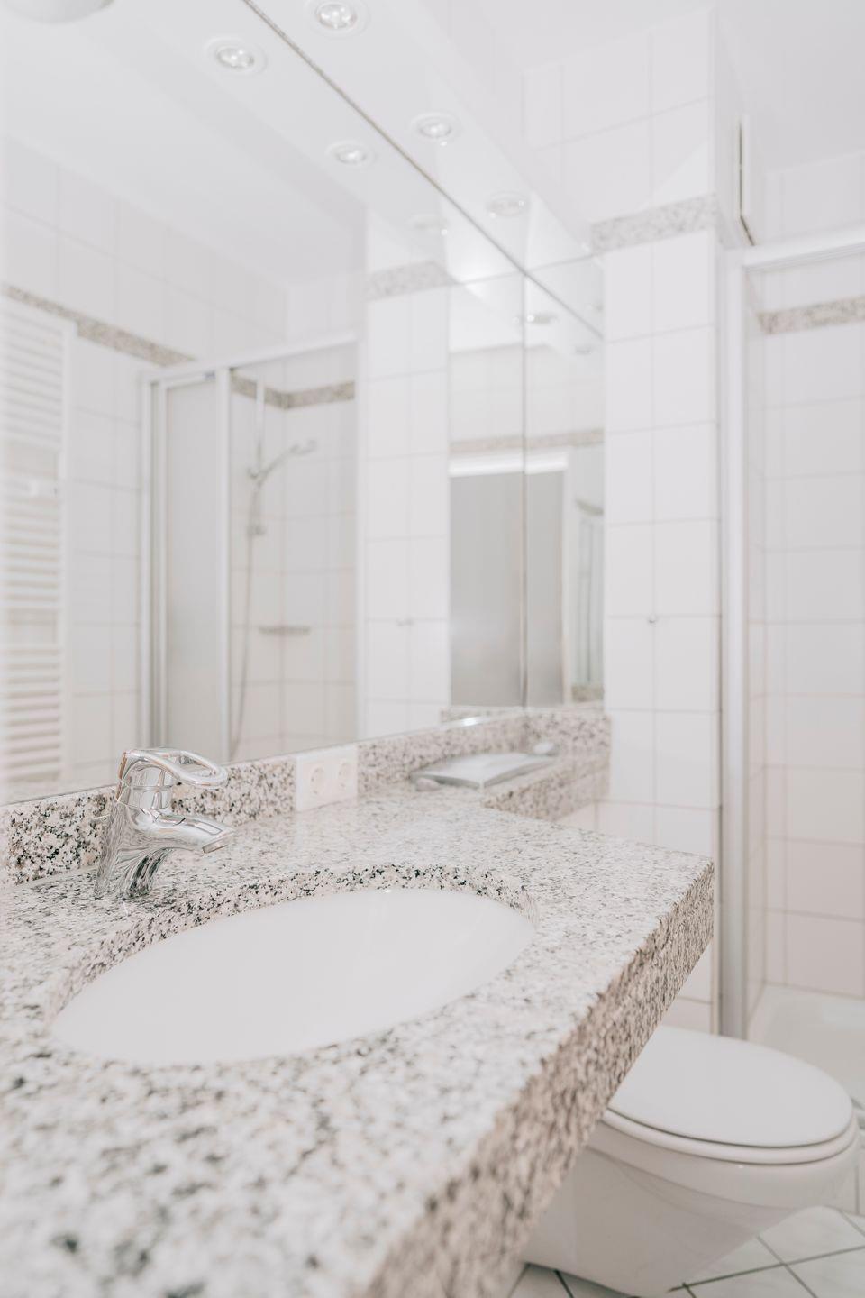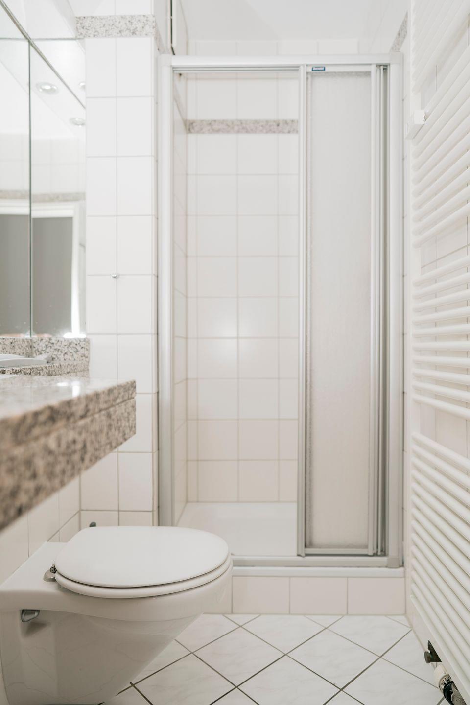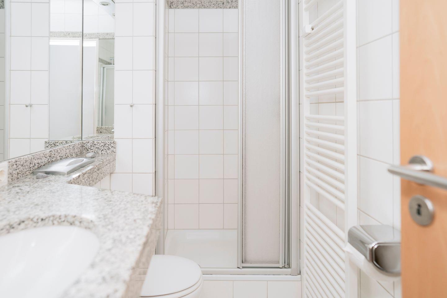 Das Badezimmer ist modern eingerichtet und verfügt über Dusche und WC.