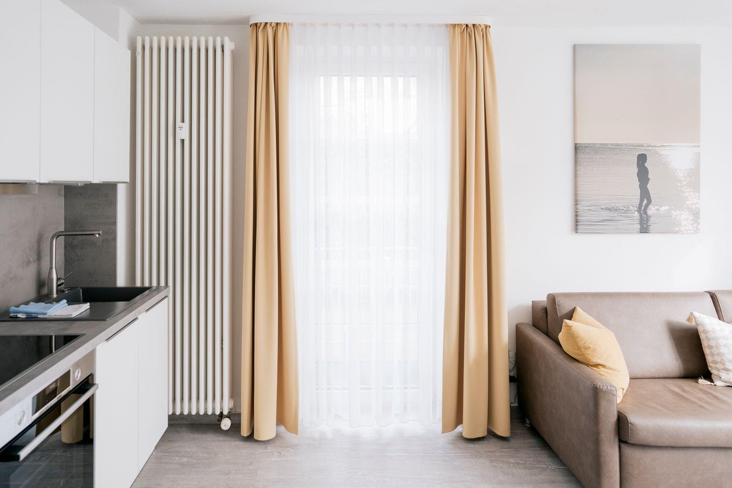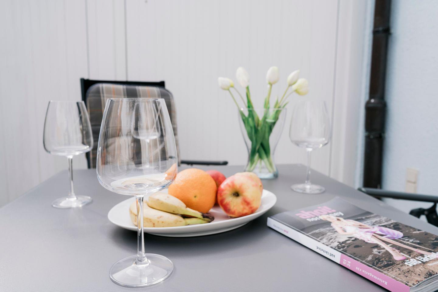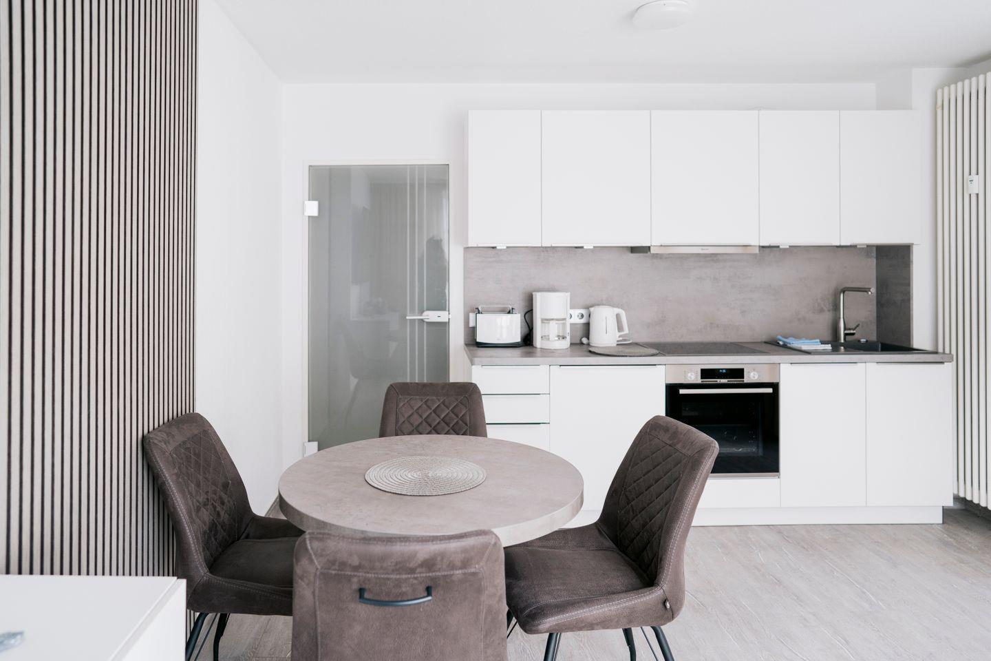 Der helle Wohnbereich wird durch eine integrierte Küchenzeile mit Essecke, Geschirrspüler, Kühlschrank, Cerankochfeld und Mikrowelle praktisch ergänzt. Geschirr, Töpfe, Kaffeemaschine sowie Wasserkocher und Toaster gehören zur weiteren zur Ausstattung.