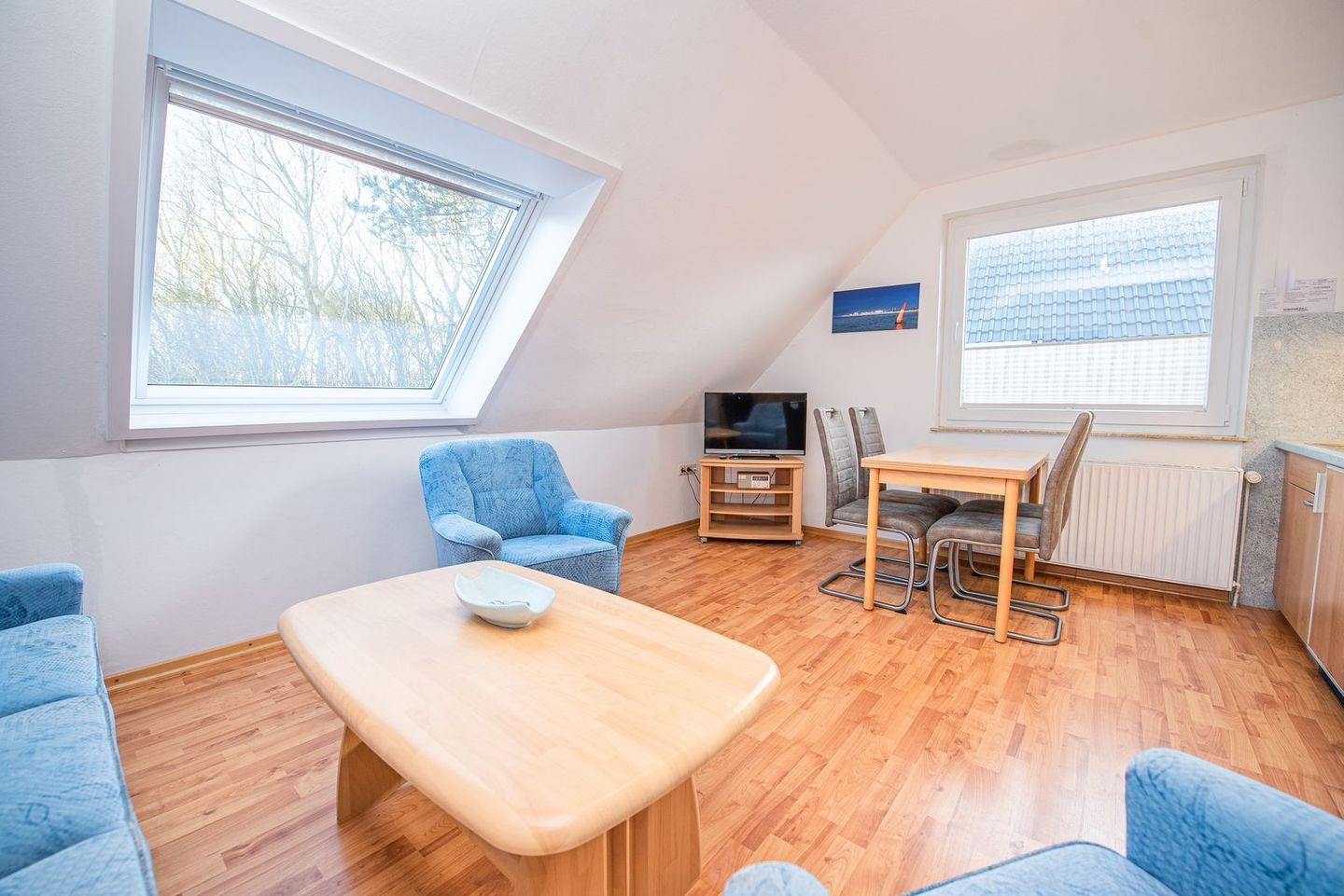Diese gemütlich eingerichtete 3-Zimmer-Wohnung mit ca. 55 m² befindet sich im 1. Obergeschoss und überzeugt durch ihre clevere Raumaufteilung sowie den besonderen Charme der teils schrägen Wände. Sie ist ideal für einen entspannten Familienurlaub geeignet.