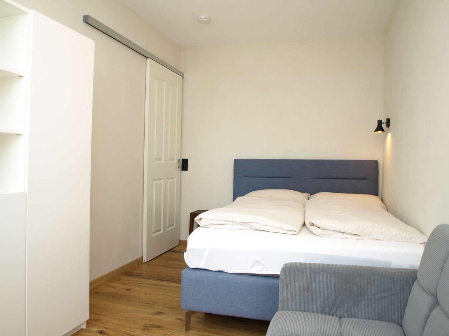 Ein Schlafzimmer ist mit einem Doppelbett (1,80 x 2,00m), einem weißen Schrank und einem Relaxsessel ausgestattet.