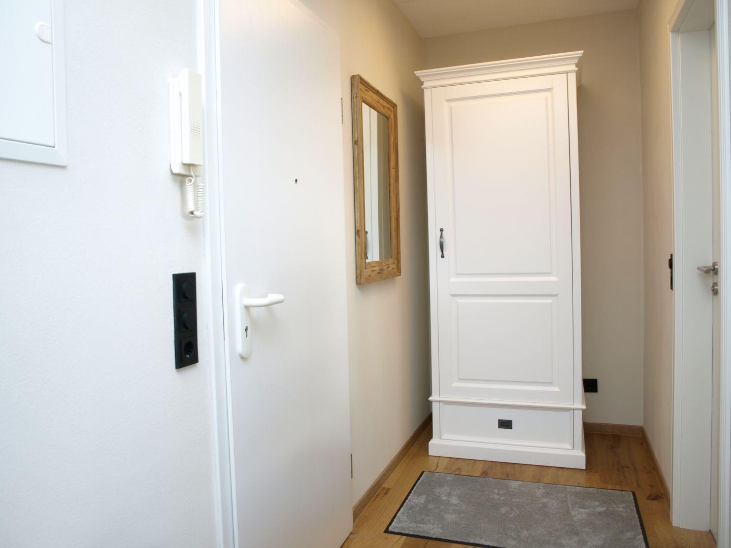 Der Eingangsbereich bietet einen Garderobenschrank, Abstellmöglichkeiten für Schuhe und einen Spiegel.