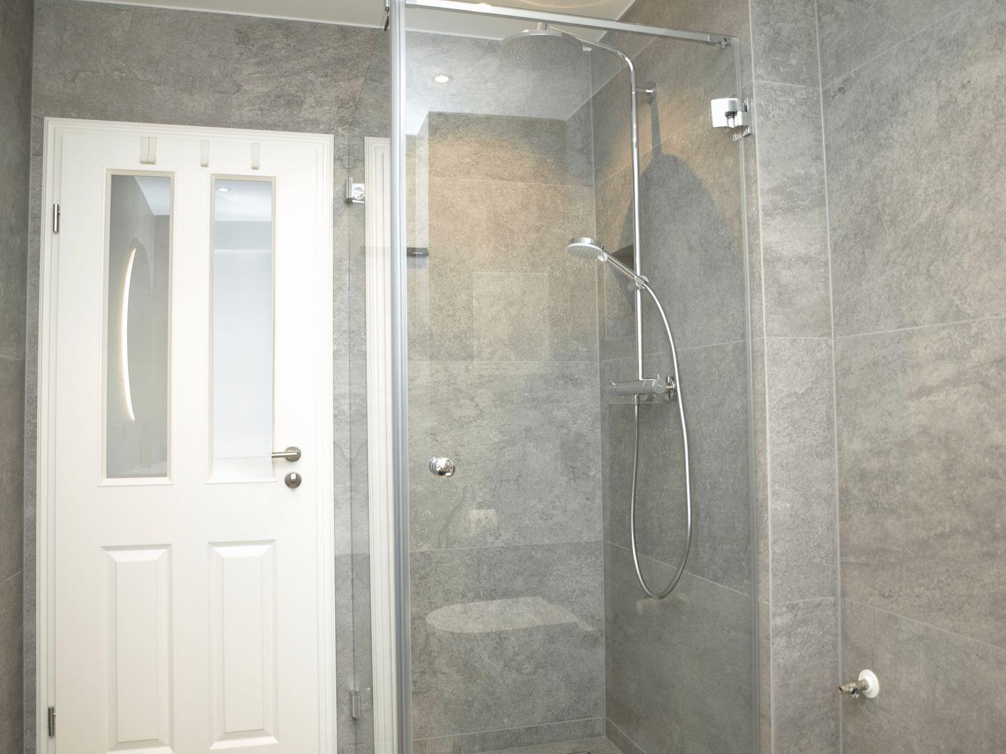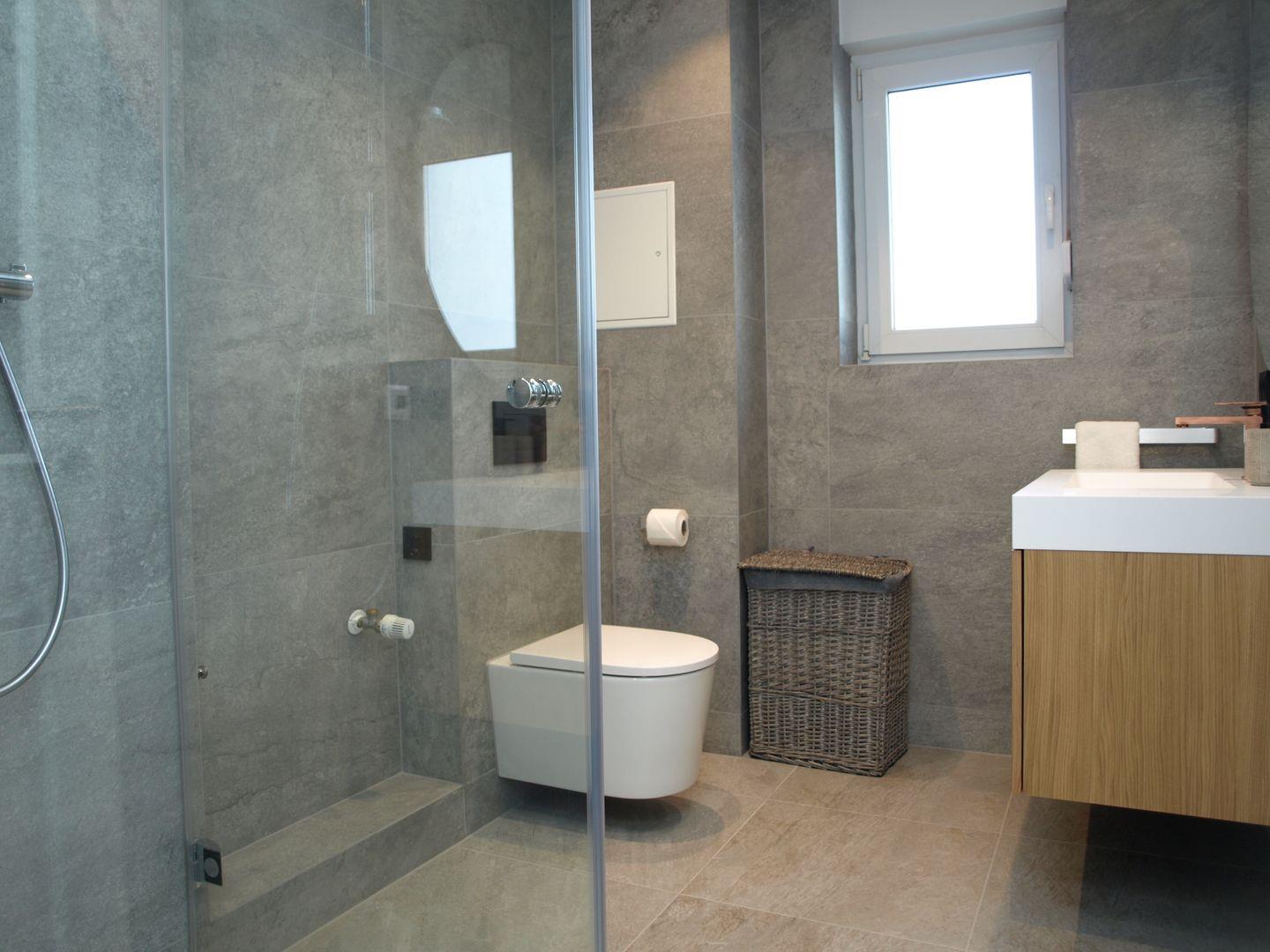 Das in Steinoptik gehaltene Badezimmer hat eine Dusche und Toilette sowie einen Waschtischunterschrank, Fußbodenheizung und Handtuchheizkörper.