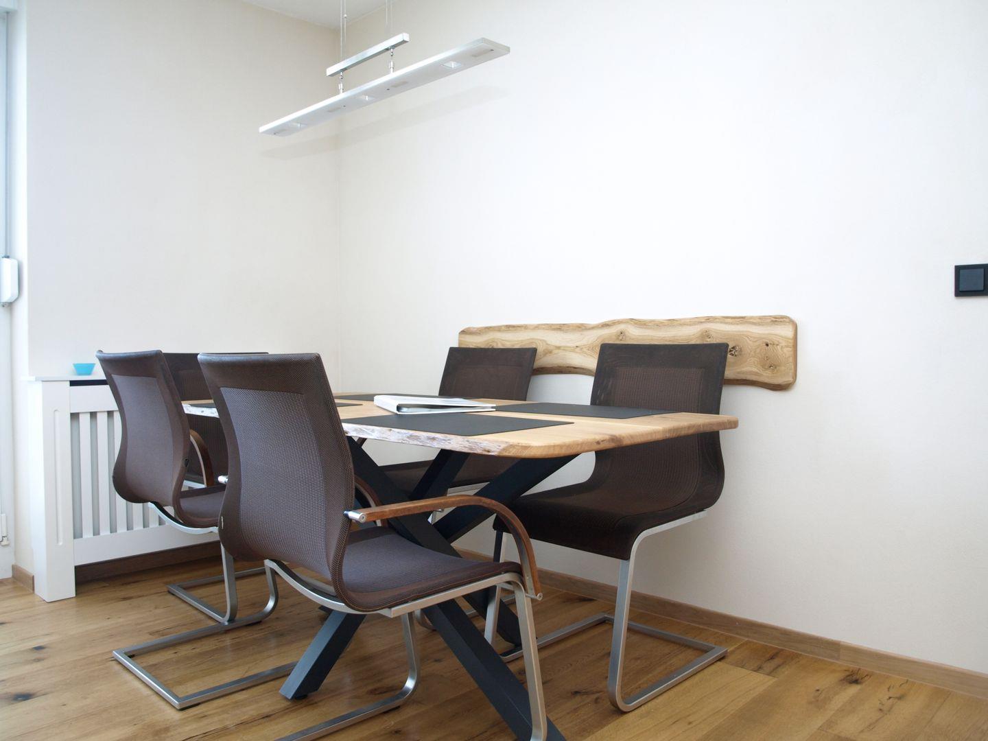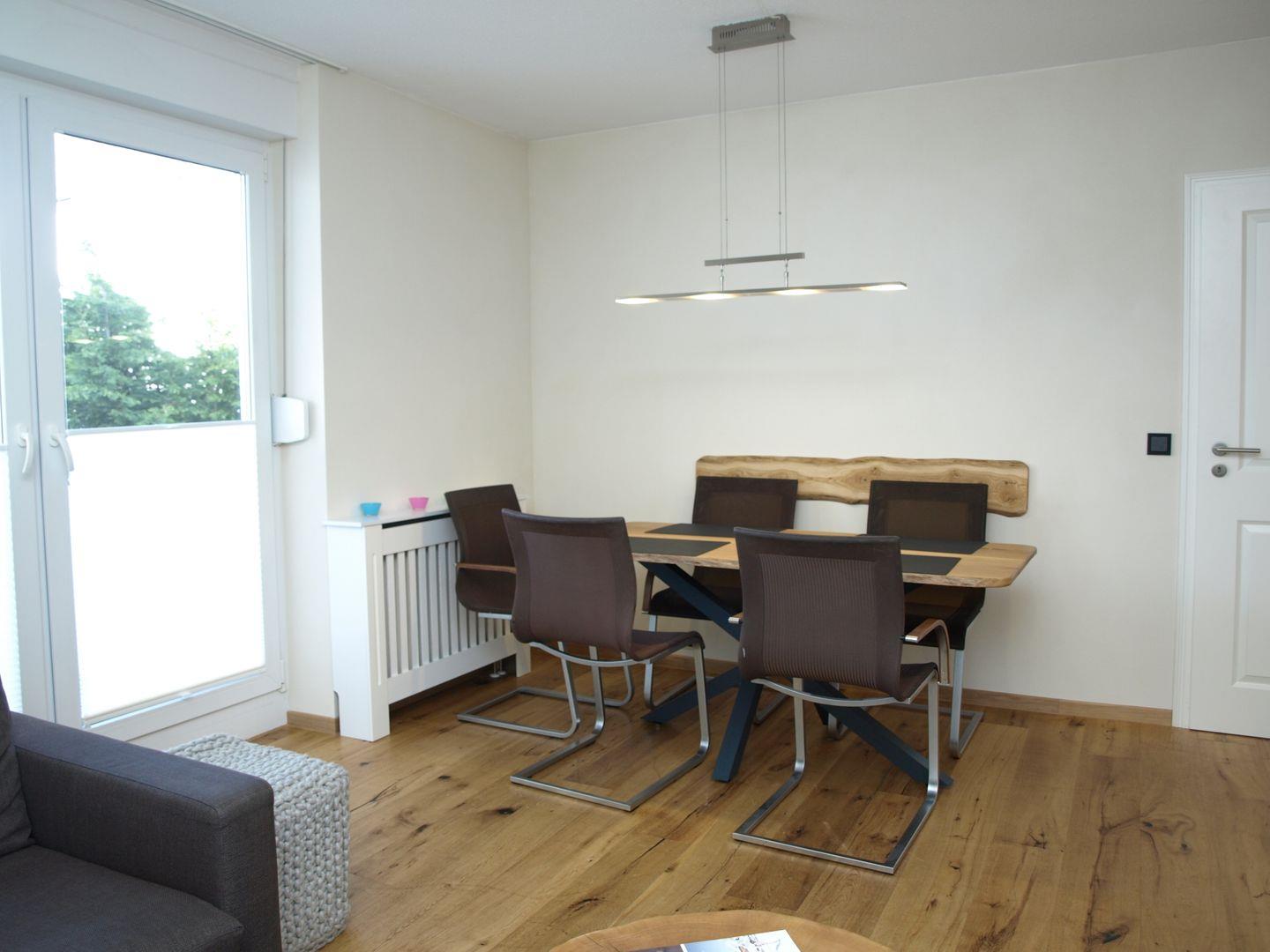 Der handgemachte Eichenholzesstisch lädt zum ausgiebigen Frühstück oder langen Spieleabenden ein.