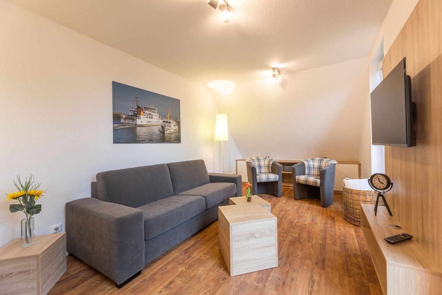Die komfortable und sehr geschmackvoll eingerichtete Ferienwohnung auf ca. 80 qm und drei Räumen überzeugt durch ihre ruhige Lage. Der helle und freundliche Wohnbereich mit bodentiefen Fenstern verfügt über einen geräumigen Essplatz für 4-6 Personen.