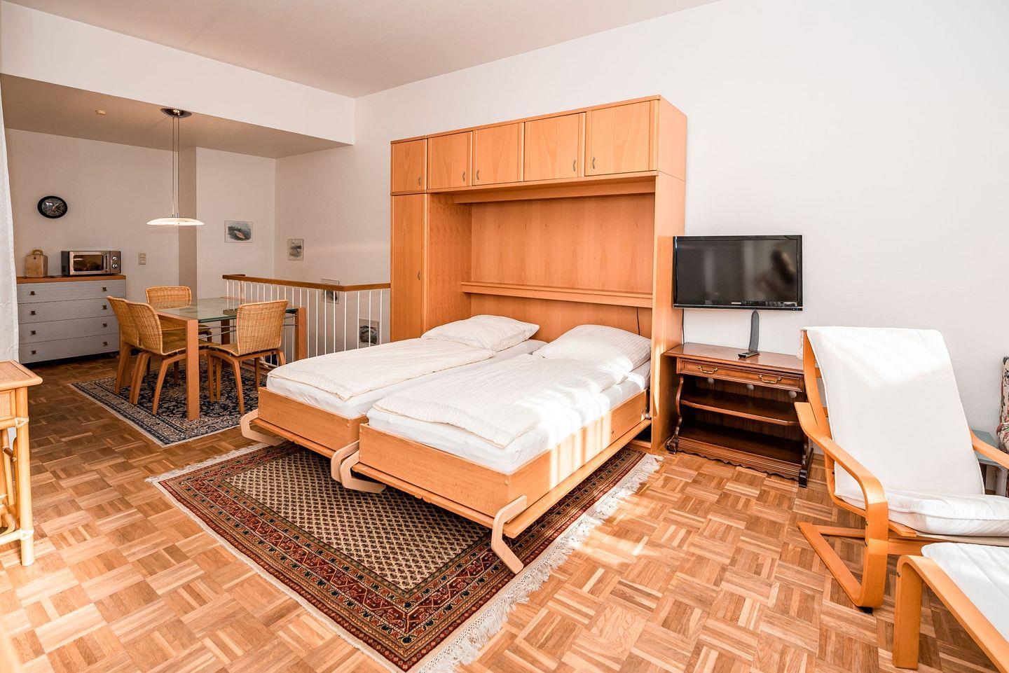 Im Erdgeschoss befindet sich der großzügige Wohnraum mit zusätzlichen Schrankbetten sowie Radio und TV. Die integrierte moderne Küchenzeile ist komplett ausgestattet.