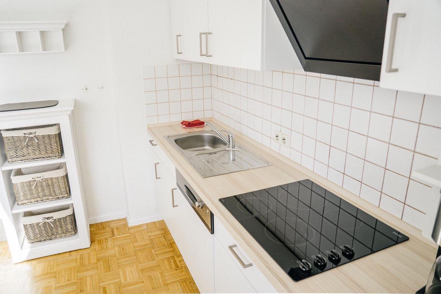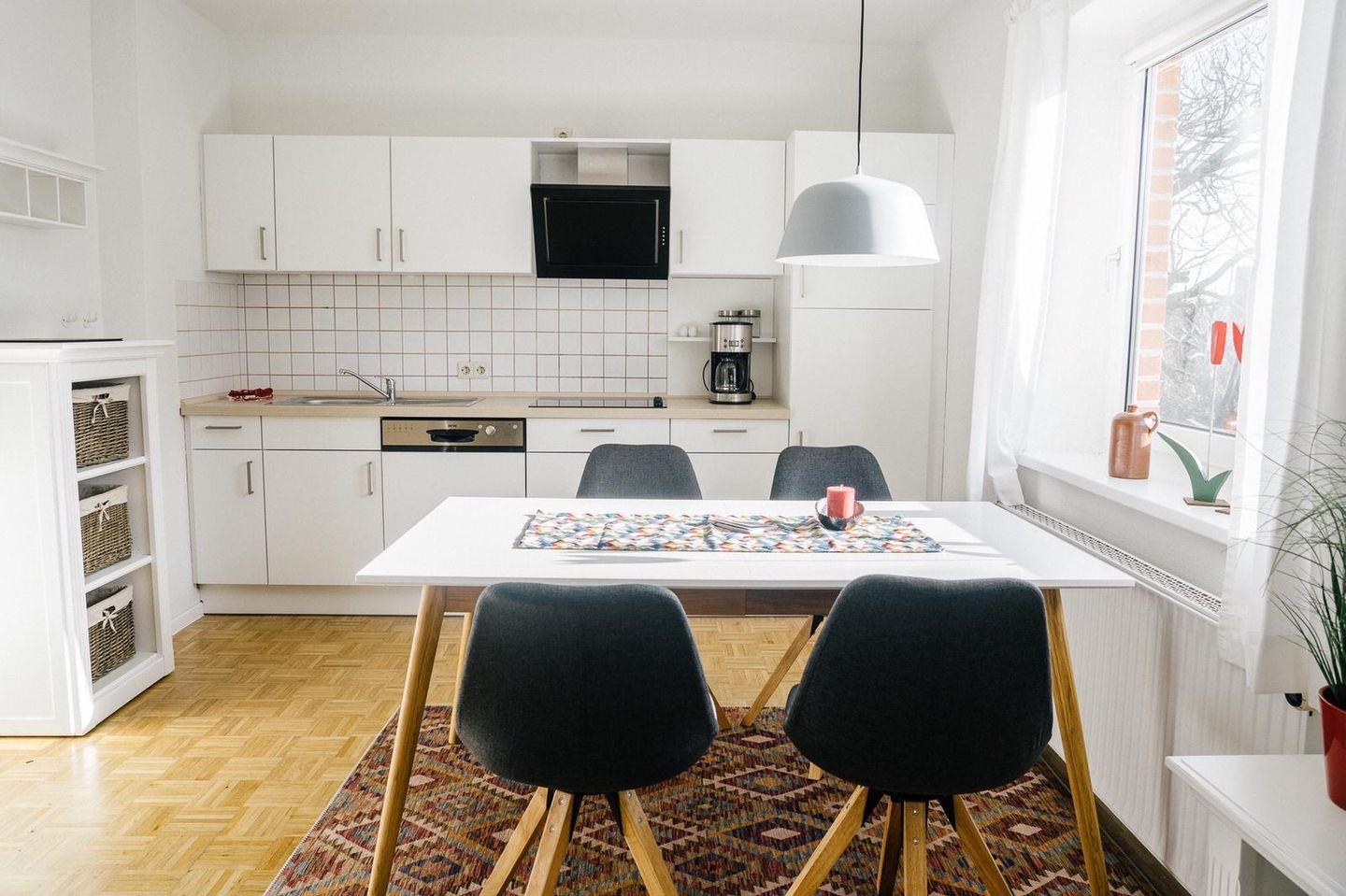 Die offene Küchenzeile ist vollständig ausgestattet und lässt keine Wünsche offen: Elektroherd, Geschirrspüler, Mikrowelle, Kühlschrank, Kaffeemaschine und Toaster stehen Ihnen zur Verfügung. Der separate Essplatz direkt am Fenster bietet Platz für vier Personen und lädt zu gemeinsamen Mahlzeiten ein.