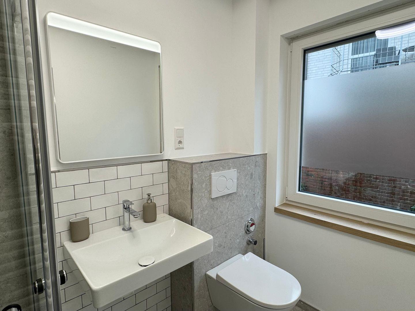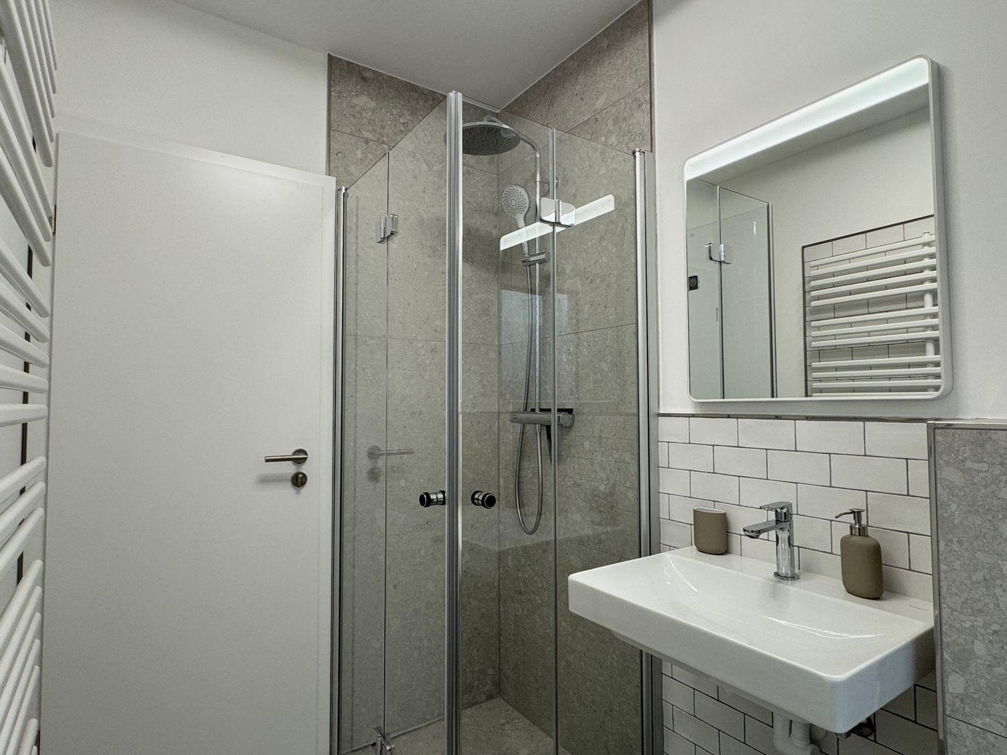 Das Badezimmer ist vollständig modernisiert und verfügt über eine bodentiefe Dusche, hochwertige Armaturen und ein ansprechendes, zeitloses Design.