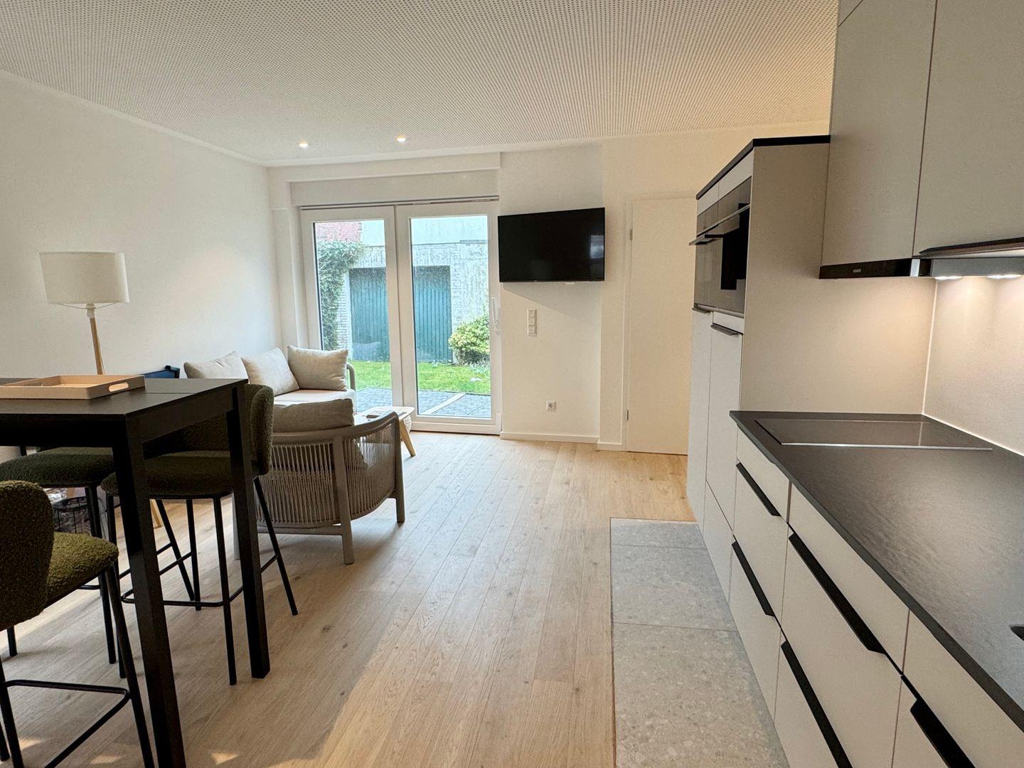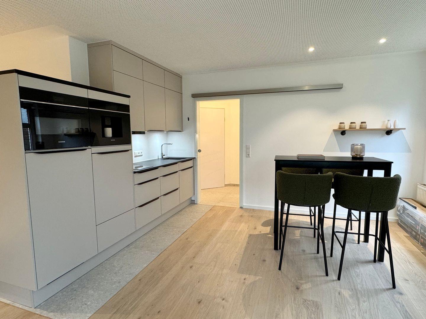 Ein Backofen mit integrierter Mikrowelle, zwei Induktionsfelder, ein Geschirrspüler, ein Kühlschrank mit Gefrierfach sowie eine eingebaute Kaffeemaschine stehen Ihnen zur Verfügung. Der Essbereich befindet sich direkt im Wohnraum und besteht aus einem erhöhten Tisch mit vier Hockern – perfekt für gemeinsame Mahlzeiten oder ein Glas Wein am Abend.