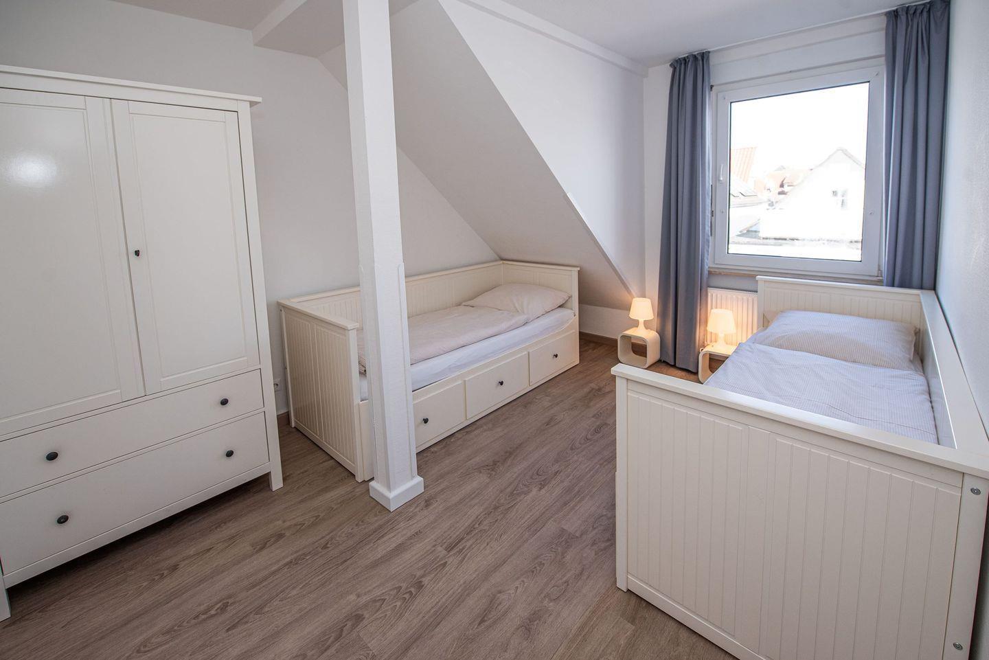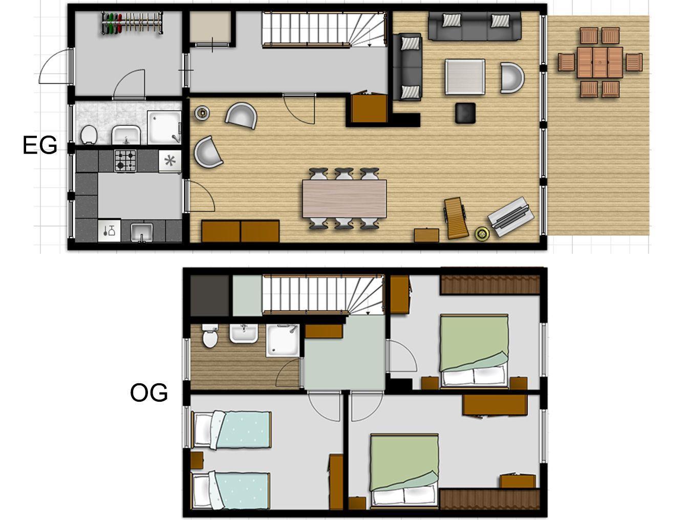 Die drei Schlafzimmer liegen im Obergeschoß. Zwei davon sind mit Doppelbetten, sowie jeweils einem Fernseher ausgestattet. In einem der Schlafzimmer befindet sich zusätzlich ein stabiles Kinderbett. Das dritte Schlafzimmer, mit zwei einzeln stehenden Kojenbetten.
