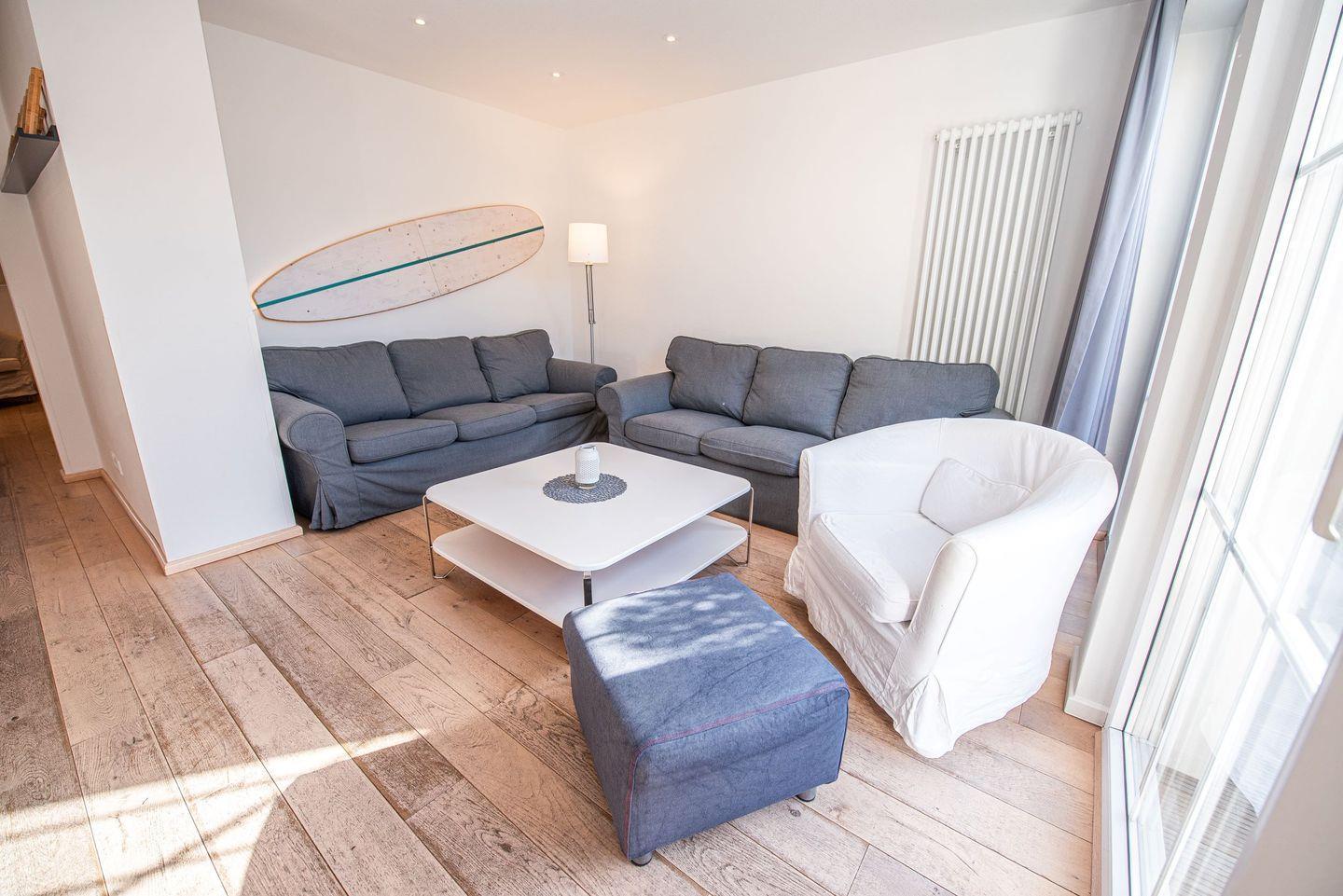 Das möblierte Wohnzimmer bietet viel Platz für gemeinsame Aktivitäten. Vom Wohn- und Essbereich gelangt man in den Garten des Hauses.