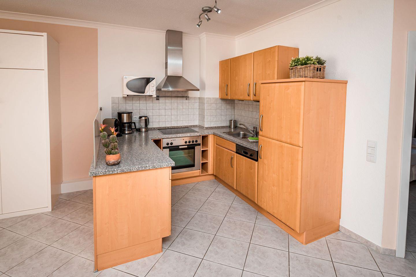 Diese großzügige Zweiraumwohnung im 2. Obergeschoss bietet auf ca. 55 m² modernen Komfort und ein stilvolles Ambiente. Der helle, geflieste Wohnraum ist allergikerfreundlich gestaltet und durch einen eleganten Tresen optisch vom Küchenbereich getrennt. Hier befindet sich ein Schrankdoppelbett, das sich bei Bedarf für weitere Gäste ausklappen lässt.