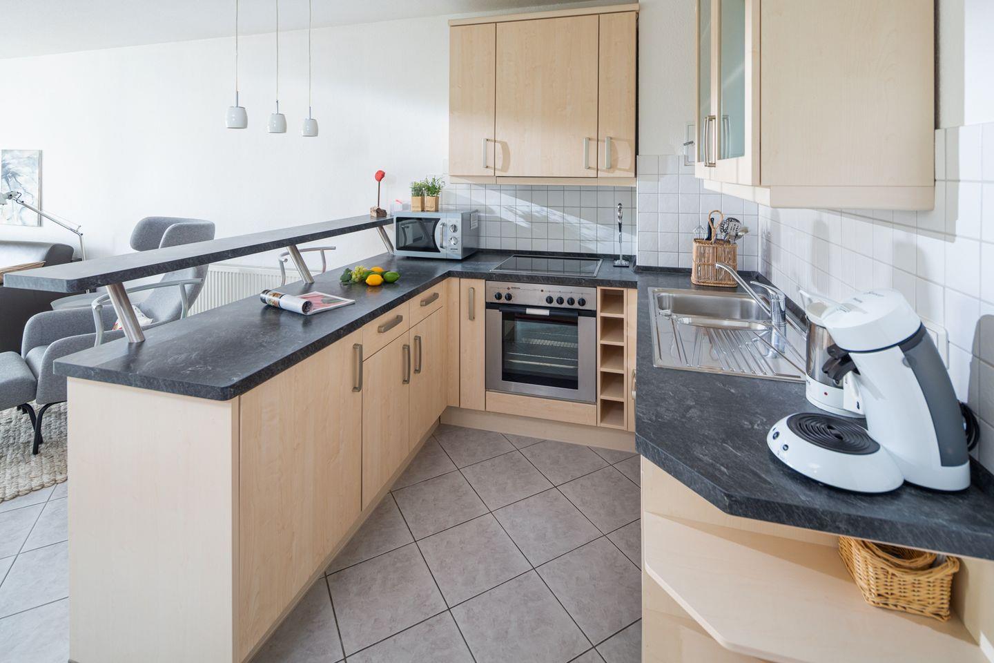 Diese großzügige Zweiraumwohnung im 3. Obergeschoss bietet auf etwa 55 m² modernen Komfort und eine freundliche Atmosphäre. Die helle, komplett geflieste Wohnung ist allergikerfreundlich und besticht durch eine geschmackvolle Einrichtung. Die offene Küchenecke ist mit allen wichtigen Geräten ausgestattet, darunter ein Kühlschrank, Backofen, Mikrowelle, Geschirrspüler, Kaffeemaschine, Pads-Kaffeemaschine, Toaster und Wasserkocher – ideal für die Zubereitung von Frühstück und umfangreichen Mahlzeiten. Ein eleganter Tresen trennt die Küche optisch vom Wohnbereich.