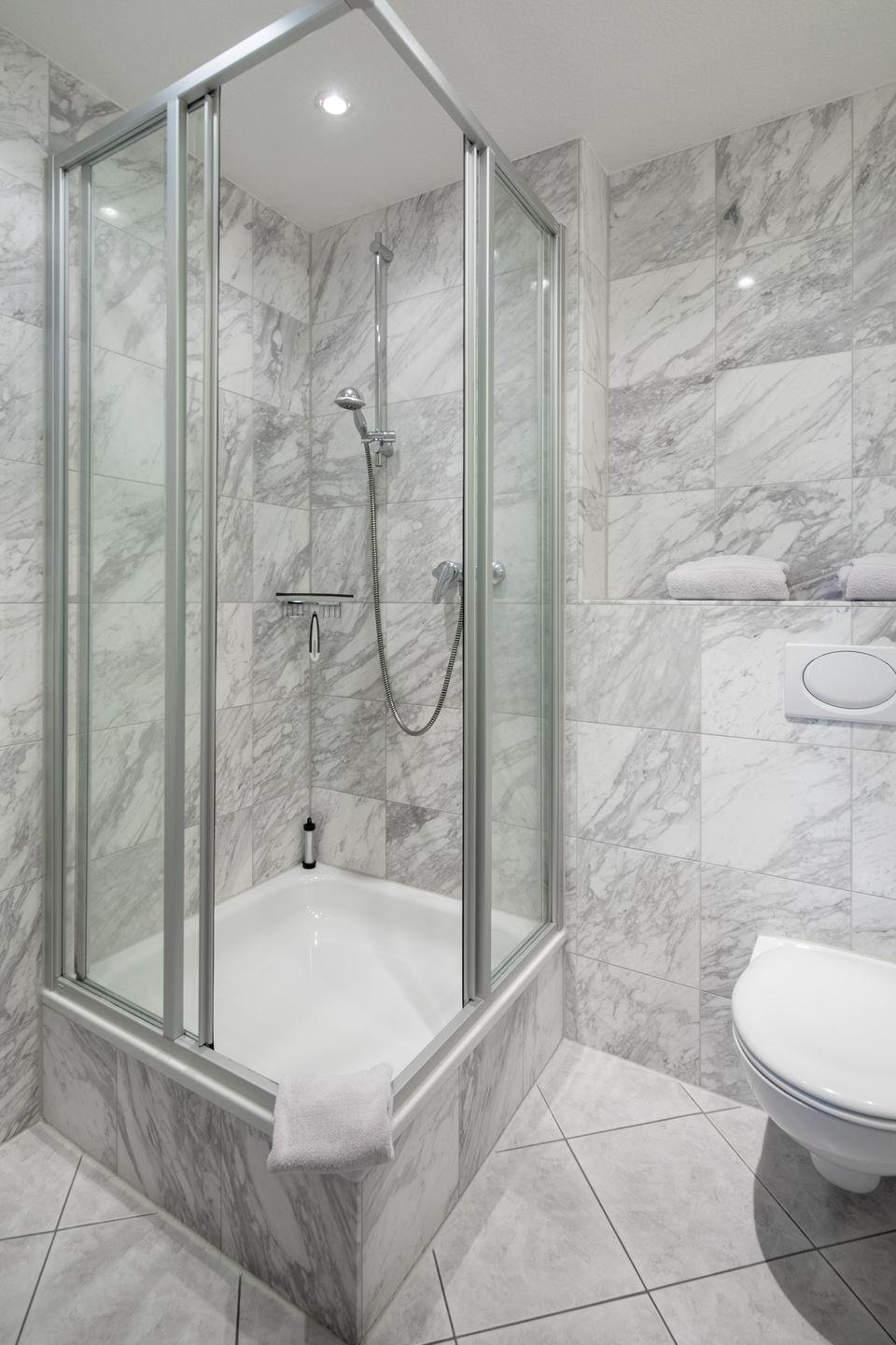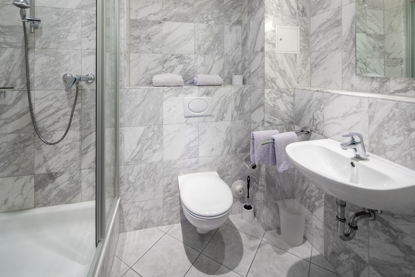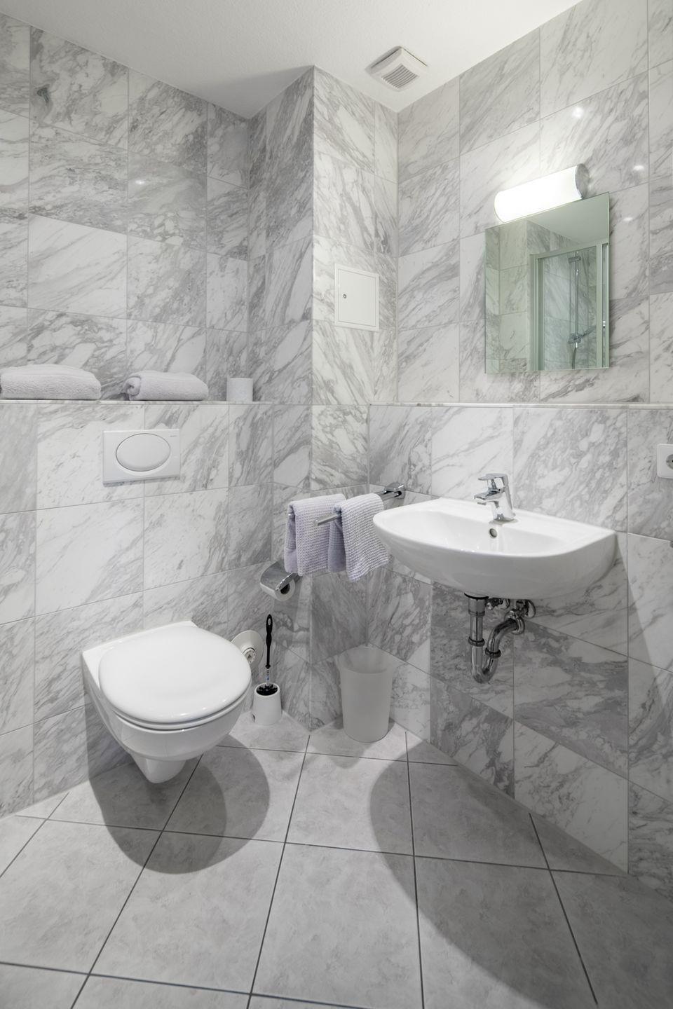 Die Schlafplätze bestehen aus einem komfortablen Boxspringbett im separaten Schlafzimmer und einer ausziehbaren Ledercouch im Wohnzimmer, die sich zu einem Doppelbett umwandeln lässt. Das Badezimmer ist modern ausgestattet mit einer Dusche, WC, Fußbodenheizung, Handtuchheizkörper und edlen Marmorfliesen.