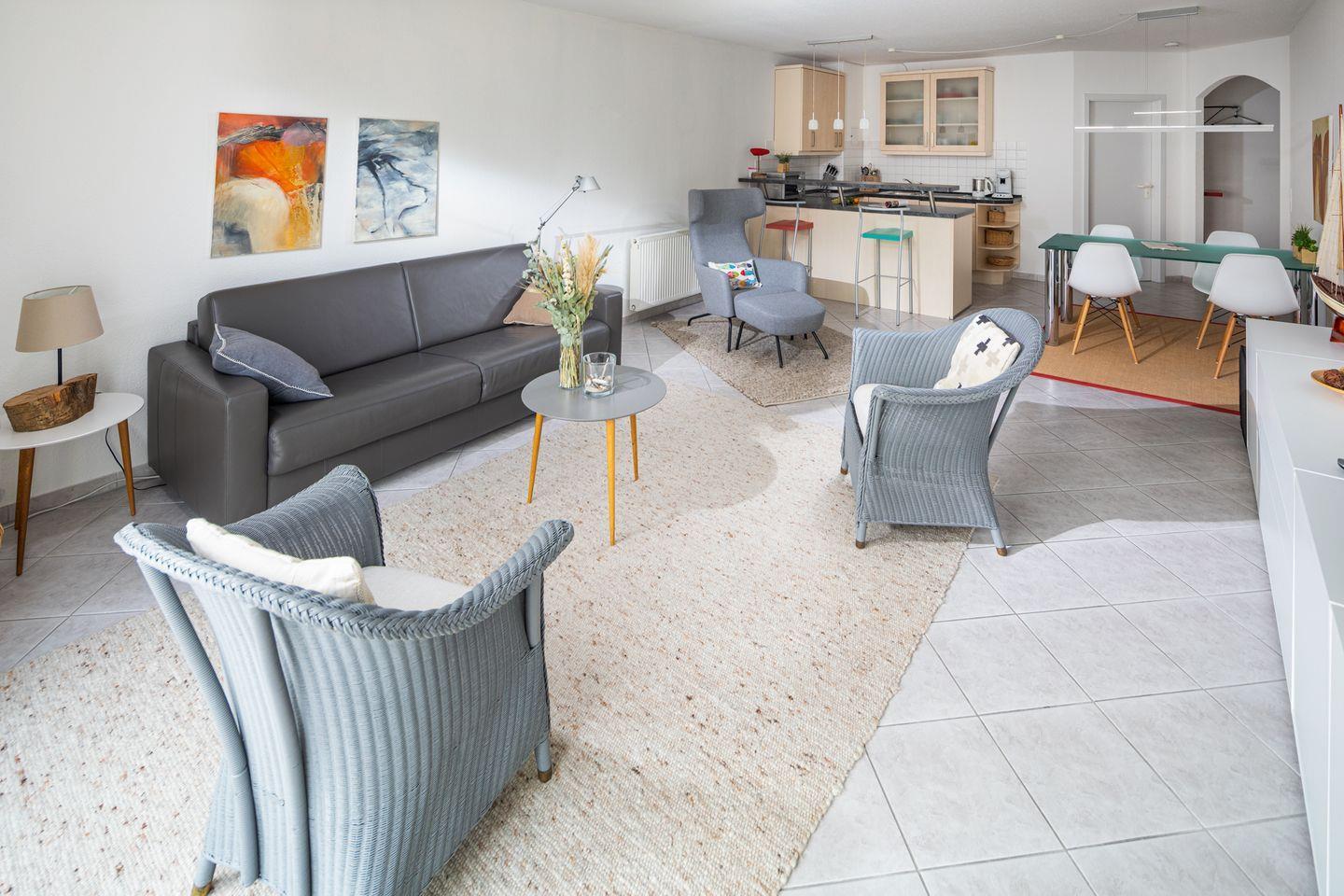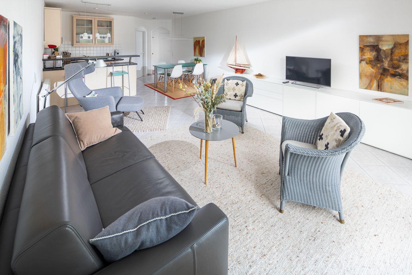 Der Wohnraum verfügt über einen gemütlichen Essplatz mit Glastisch und vier Korbstühlen sowie eine komfortable Sitzecke mit einer schicken Ledercouch und einem bequemen Lese- oder Fernsehsessel mit Fußhocker. Für Unterhaltung sorgen Kabel-TV und ein kostenfreier WLAN-Zugang.