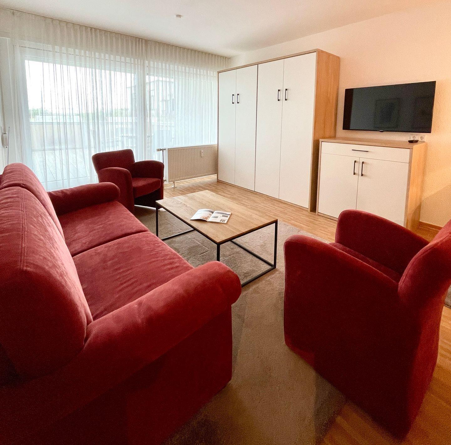 Der Wohnbereich ist in warmen Tönen gestaltet und lädt mit gemütlicher Atmosphäre zum Entspannen ein. Das Schrankdoppelbett lässt sich am Abend mit wenigen Handgriffen ausklappen und bietet zwei Personen bequemen Schlafkomfort.