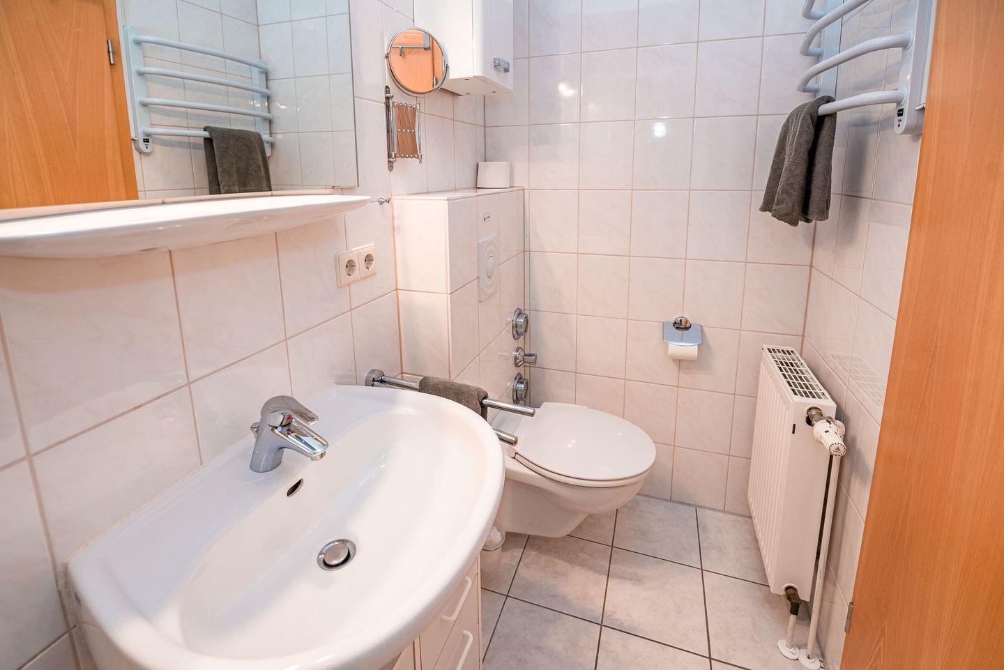 Das helle moderne Badezimmer ist mit Dusche / WC ausgestattet.