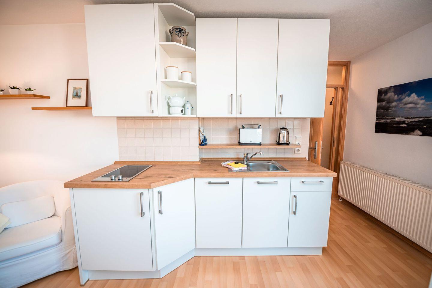 Die integrierte Küche ist mit einem 2 Plattenkochfeld, Kühlschrank mit Gefrierfach, Geschirrspülmaschine, Mikrowelle, Kaffeemaschine, Toaster und Wasserkocher ausgestattet.