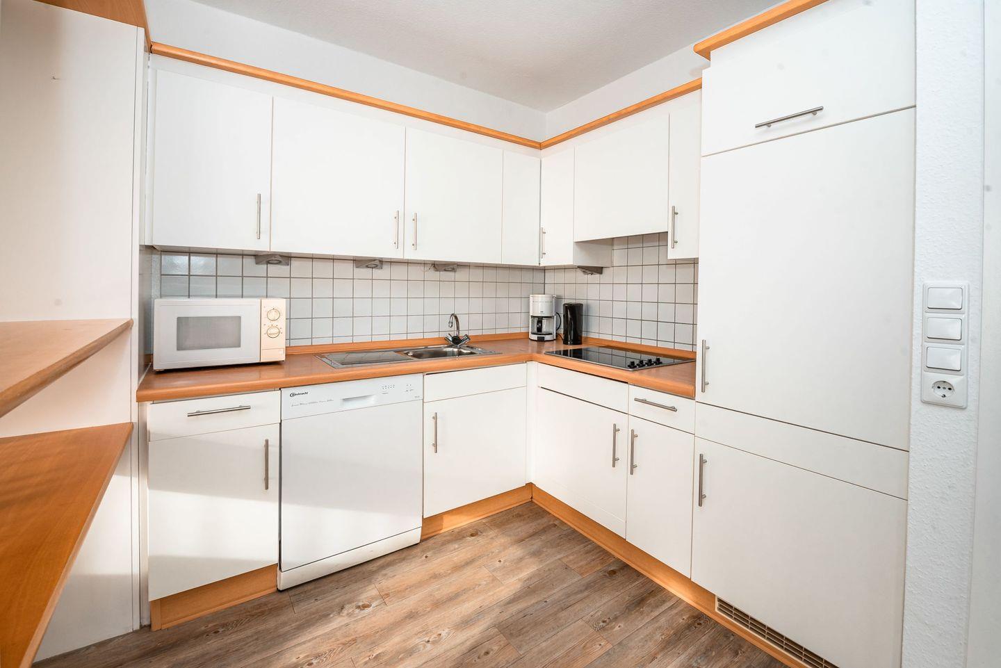 Der Wohn-/Essbereich bietet einen gemütlichen Rückzugsort. Der großzügige Esstisch lädt zum Verweilen ein und bietet genügend Platz für ausgedehnte Mahlzeiten. Die offene Küche mit u.a. einer Spülmaschine und Mikrowelle grenzt direkt an den Essbereich.