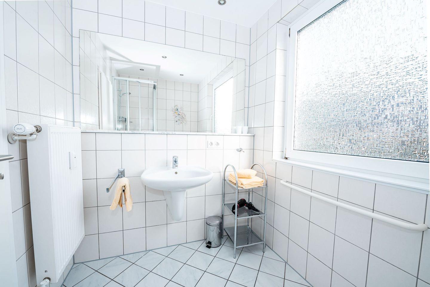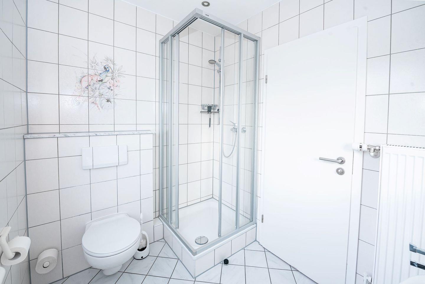 Das Tageslichtbad ist mit einem Waschbecken, einem WC sowie einer Dusche ausgestattet.