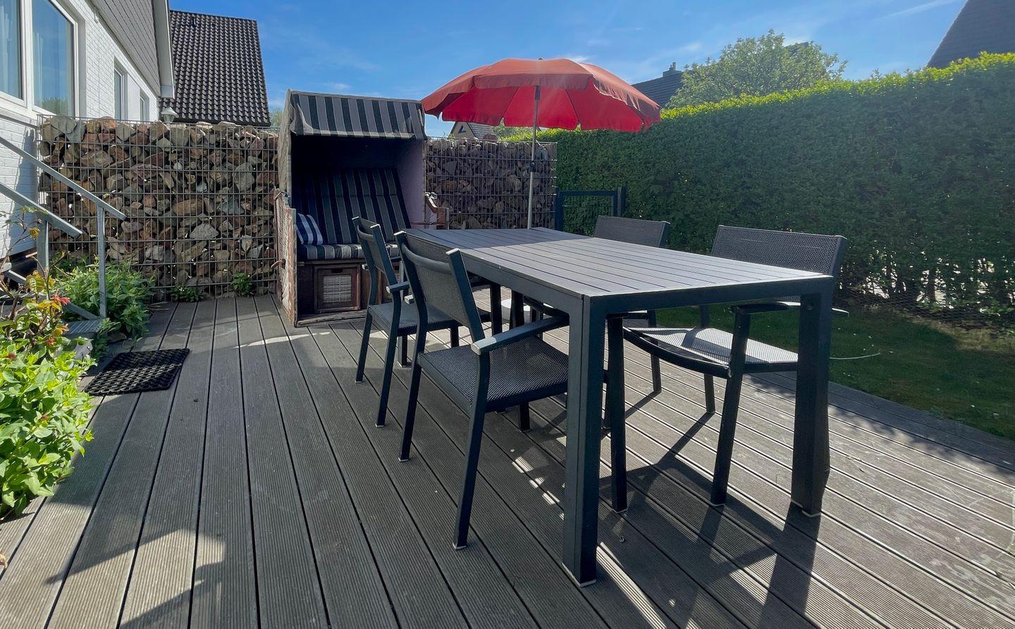 Vom Wohnbereich gelangen Sie direkt auf Ihre eigene und schöne Süd- Terrasse mit Garten, ausgestattet mit Gartenmöbeln und einem Strandkorb. Hier können Sie unter freiem Himmel die frische Luft genießen, sich sonnen oder gemütliche Stunden verbringen.