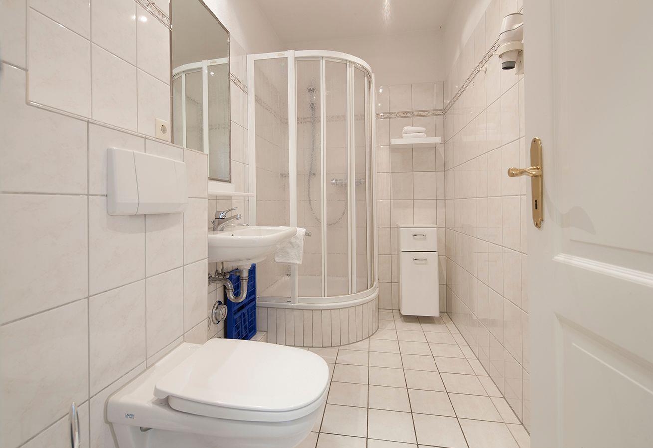 Das Badezimmer verfügt über eine Dusche, WC sowie einen Fön – modern, sauber und funktional.