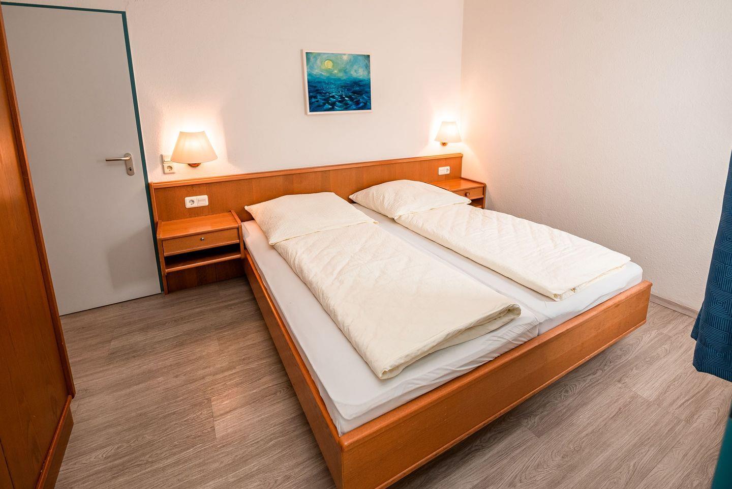 Die Wohnung verfügt über ein separates Schlafzimmer mit Doppelbett sowie einen hellen Wohnraum mit Sitzecke und Schlafcouch. Hier ist auch die integrierte Küchenzeile mit Essplatz untergebracht. Das angrenzende Badezimmer mit Dusche, WC, Waschbecken, Fön und Fenster ist über zwei kleine Stufen vom Schlafzimmer aus erreichbar.