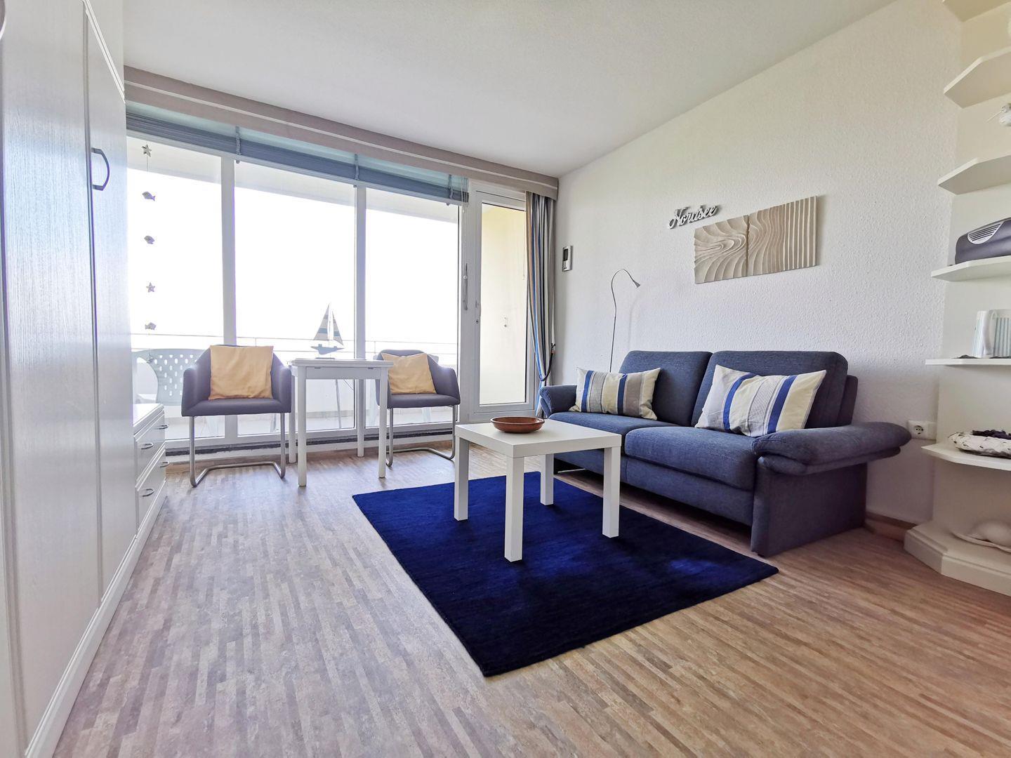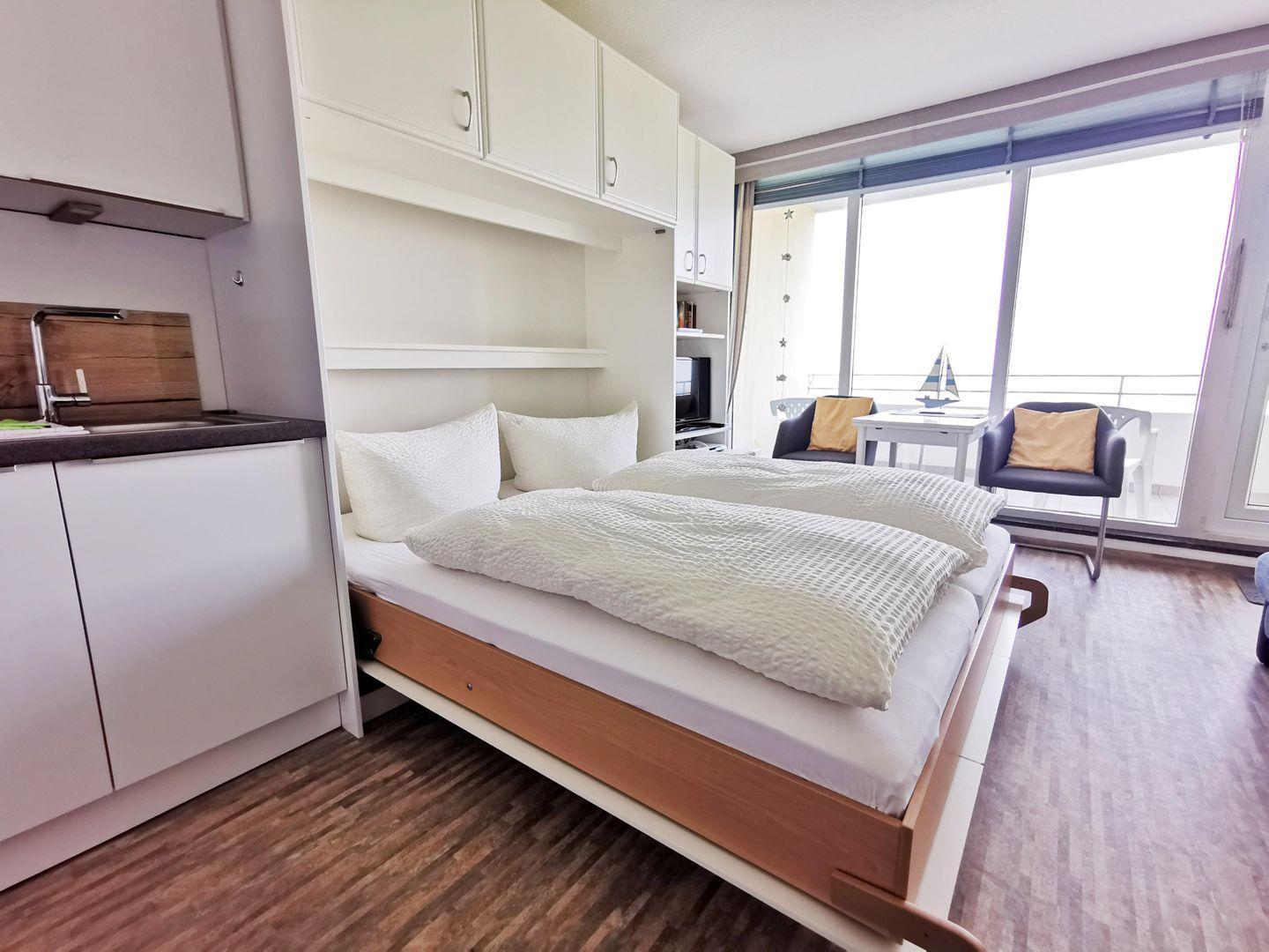 Moderne 1-Zimmer-Ferienwohnung mit direktem Meerblick und Balkon auf Norderney, ideal für Paare und nur wenige Meter vom Strand entfernt.