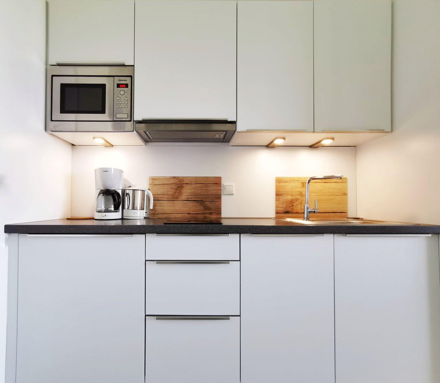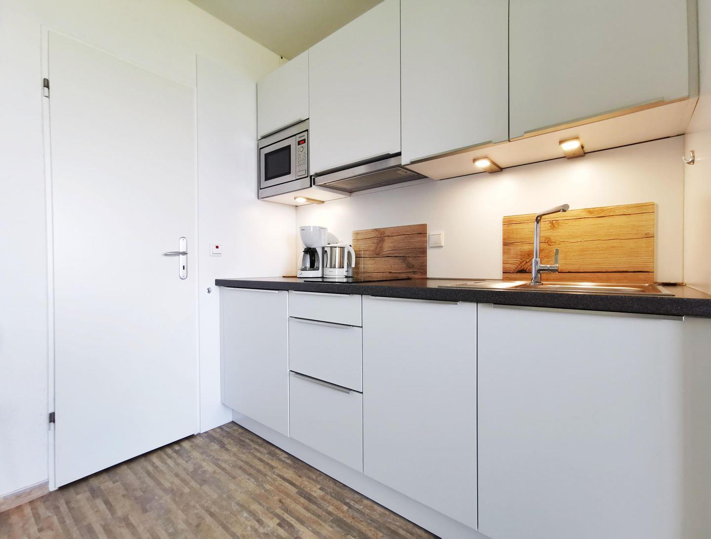 Die komplett ausgestattete Küchenzeile lässt keine Wünsche offen. Ceran-Kochfeld, Mikrowelle, Geschirrspüler, Kühlschrank, Kaffeemaschine, Toaster und Wasserkocher stehen zur Verfügung, sodass Sie sich auch im Urlaub jederzeit selbst versorgen können. Der kleine, liebevoll gestaltete Essbereich für zwei Personen eignet sich perfekt für gemeinsame Mahlzeiten.