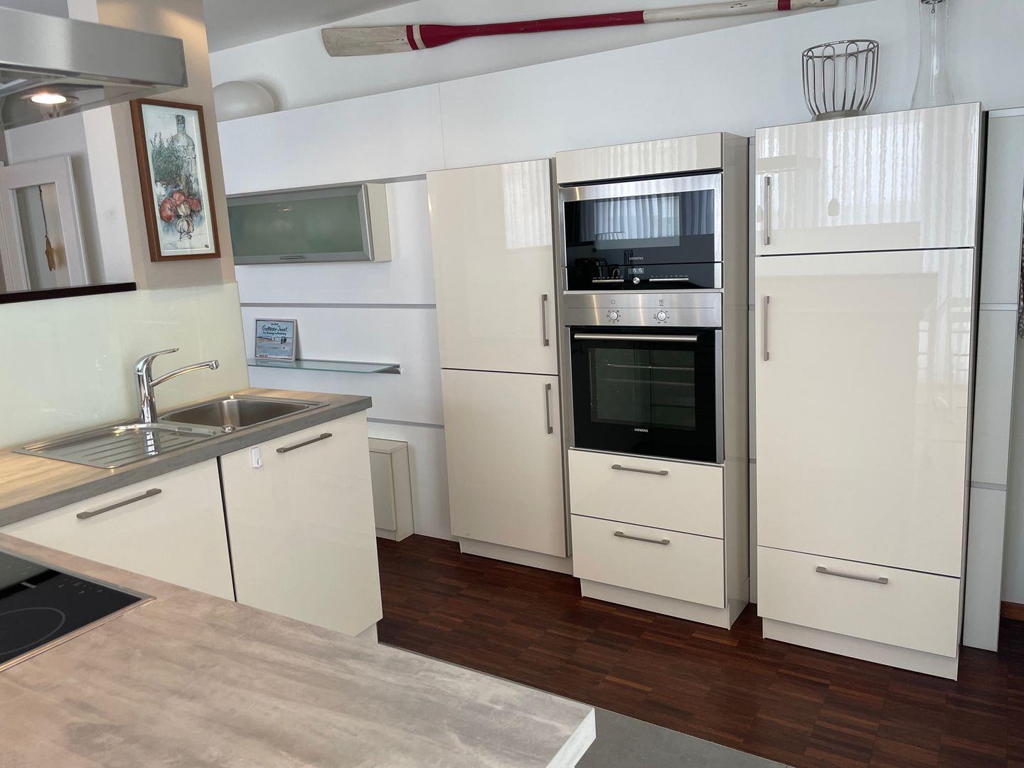 Die in den Wohnraum integrierte moderne weiße Kücheninsel ist komplett mit Ceran-Kochfeld, Dunstabzugshaube (Abzug nach außen!),
