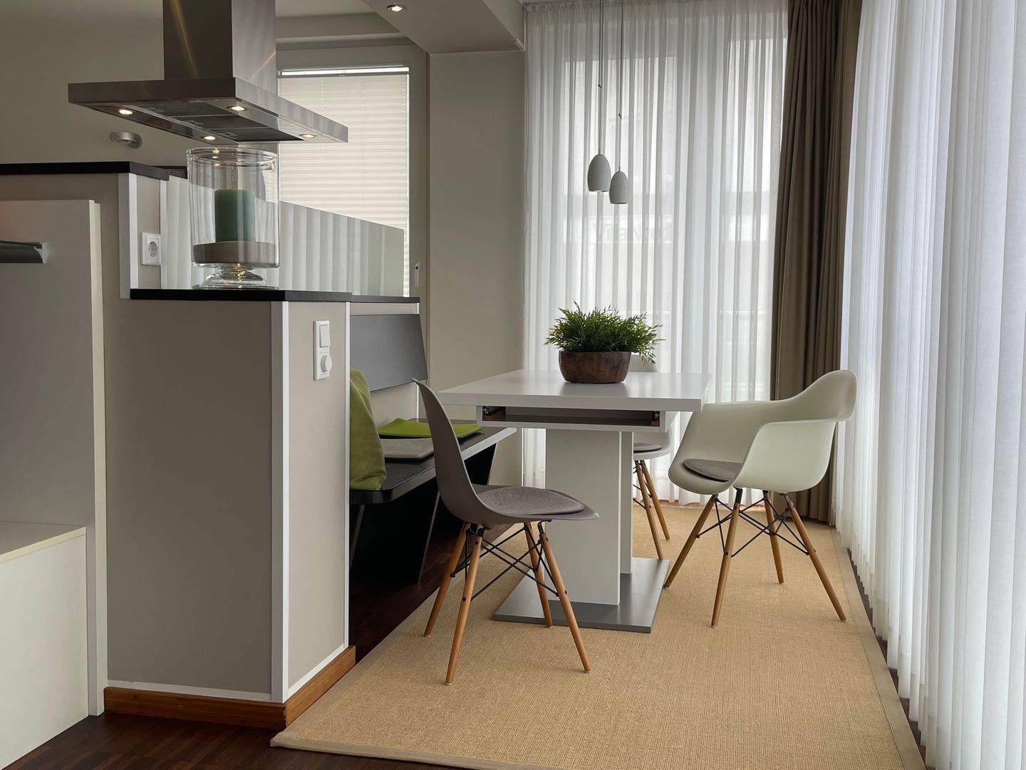 Der Essbereich besticht durch den ausziehbaren 120x80cm großen Tisch, der gemütlichen Bank und den Designerstühlen. Im Wohnbereich ist eine gemütlich Lounge-Ecke mit einem modernem Fernsehgerät. Hier kann man hervorragend entspannen.