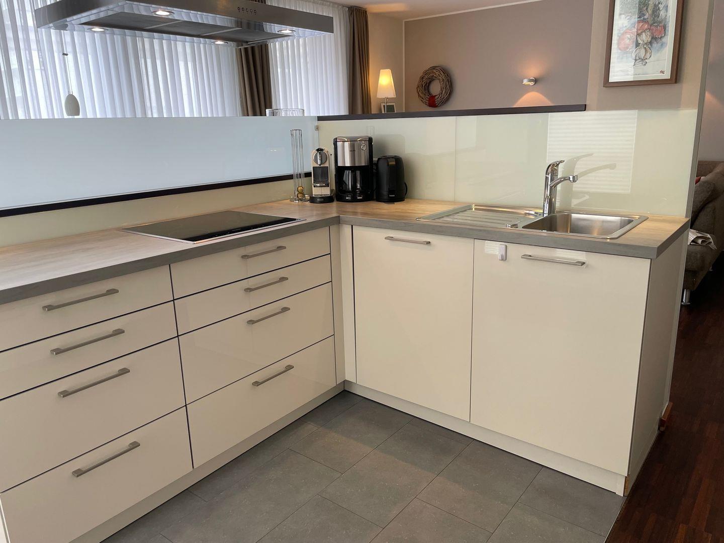 großer Geschirrspülmaschine, Backofen, Kühlschrank, Gefrierschrank und Mikrowelle ausgestattet. Filter-Kaffeemaschine, Nespresso-Kaffeemaschine Wasserkocher und Toaster bereiten Ihnen einen schönen Morgen. Weil in dieser Wohnung jeder Tag ein Sonntag ist, stehen Ihnen auch hochwertige Küchenutensilien von WMF und Porzellan der Firma Dibbern zur Verfügung.
