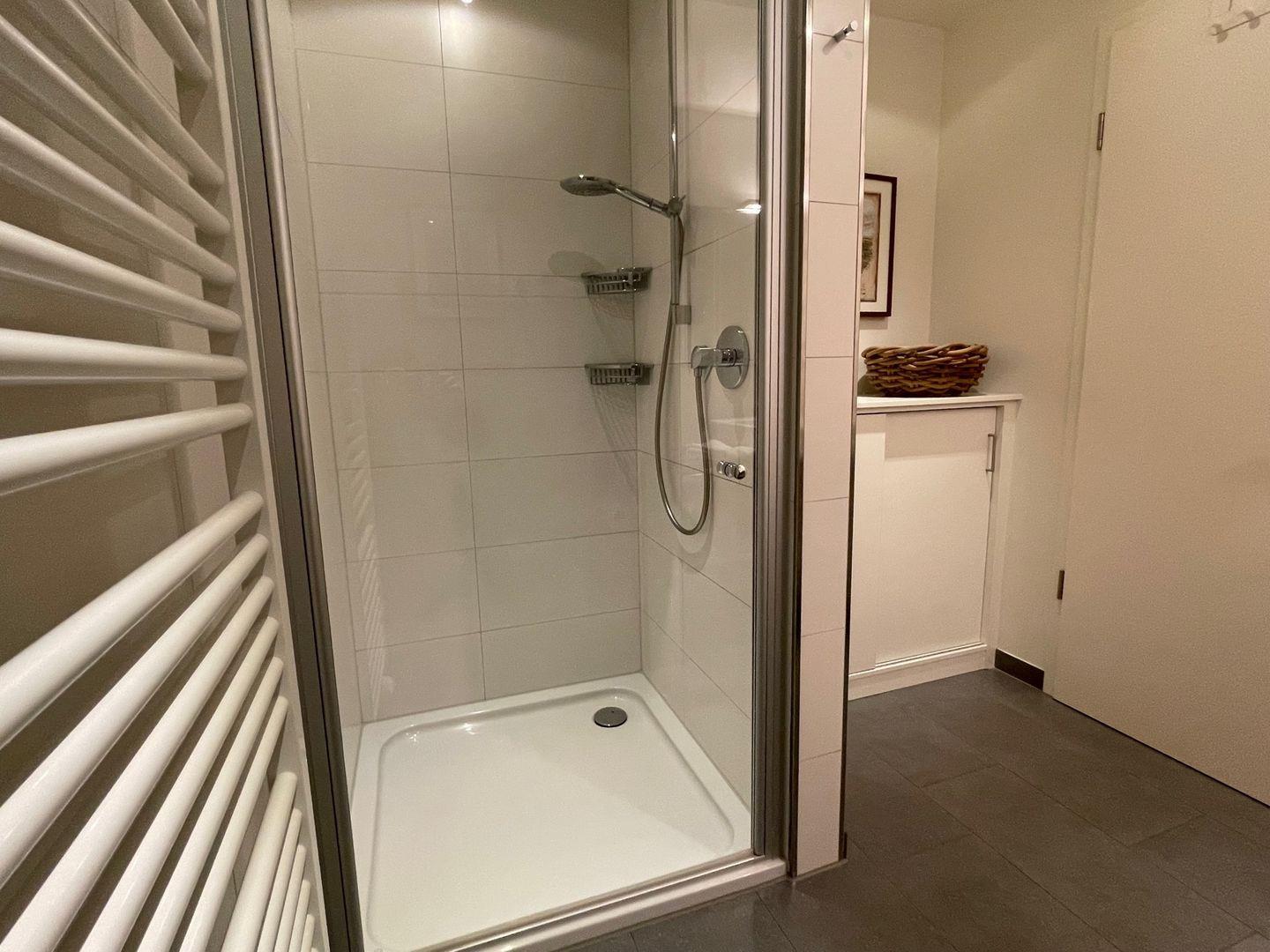 Das Bad mit Dusche und WC besticht durch seinen Natursteinboden und mit den weißen und erdig-warmen Farbtönen ein behagliches Ambiente. Es erwartet Sie eine große Dusche, komfortable Möbel mit großen Ablageflächen. Einen Fön, Dusch- und Handtücher finden Sie bei Ihrer Anreise bereits vor. Im Bad finden Sie Dusche und WC.