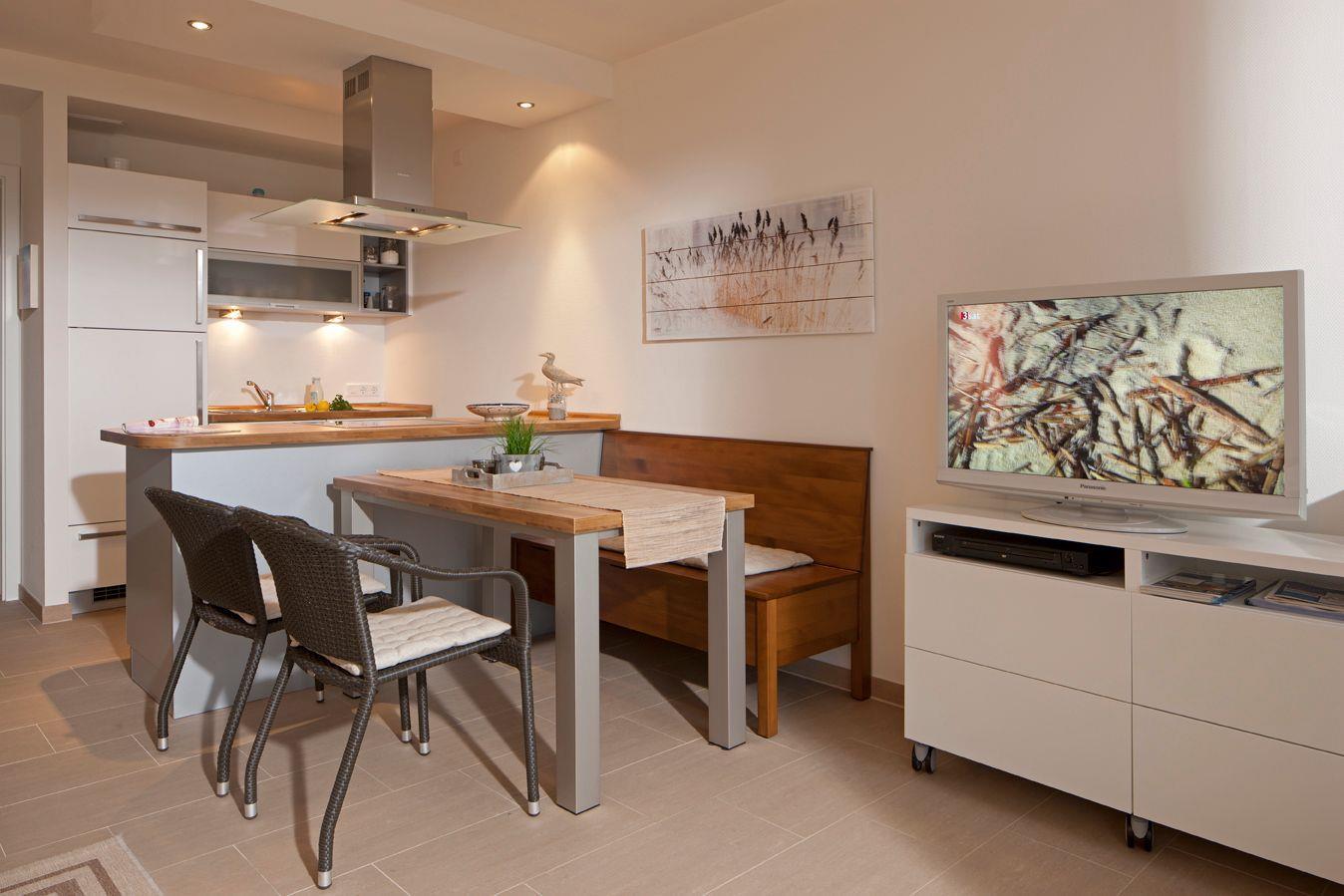 Luxuriös ist auch die in den Wohnraum integrierte Küchenzeile, die mit Geschirrspüler, Cerankochplatte (4 Kochfelder), Backofen, Kühl-/ Gefrier-Kombination, Kaffee- und Nespresso Maschine, Wasser- und Eierkocher und Toaster komplett ausgestattet ist. Neben dem Küchentresen befindet sich der modern gestaltete Essbereich.