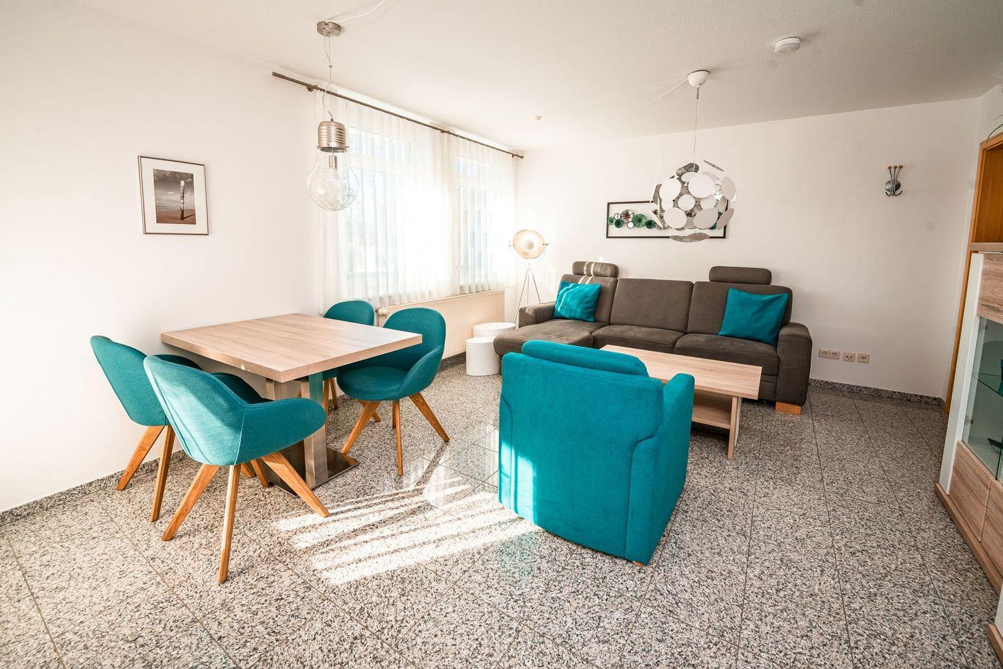 Die Wohnung verfügt im separaten Wohnbereich über einem geräumigen Essplatz für 4 Personen, sowie einer großen Couch und bequemen Sitzmöbeln. Außerdem verfügt die Wohnung über einen Flachbildschirm und Stereoanlage.