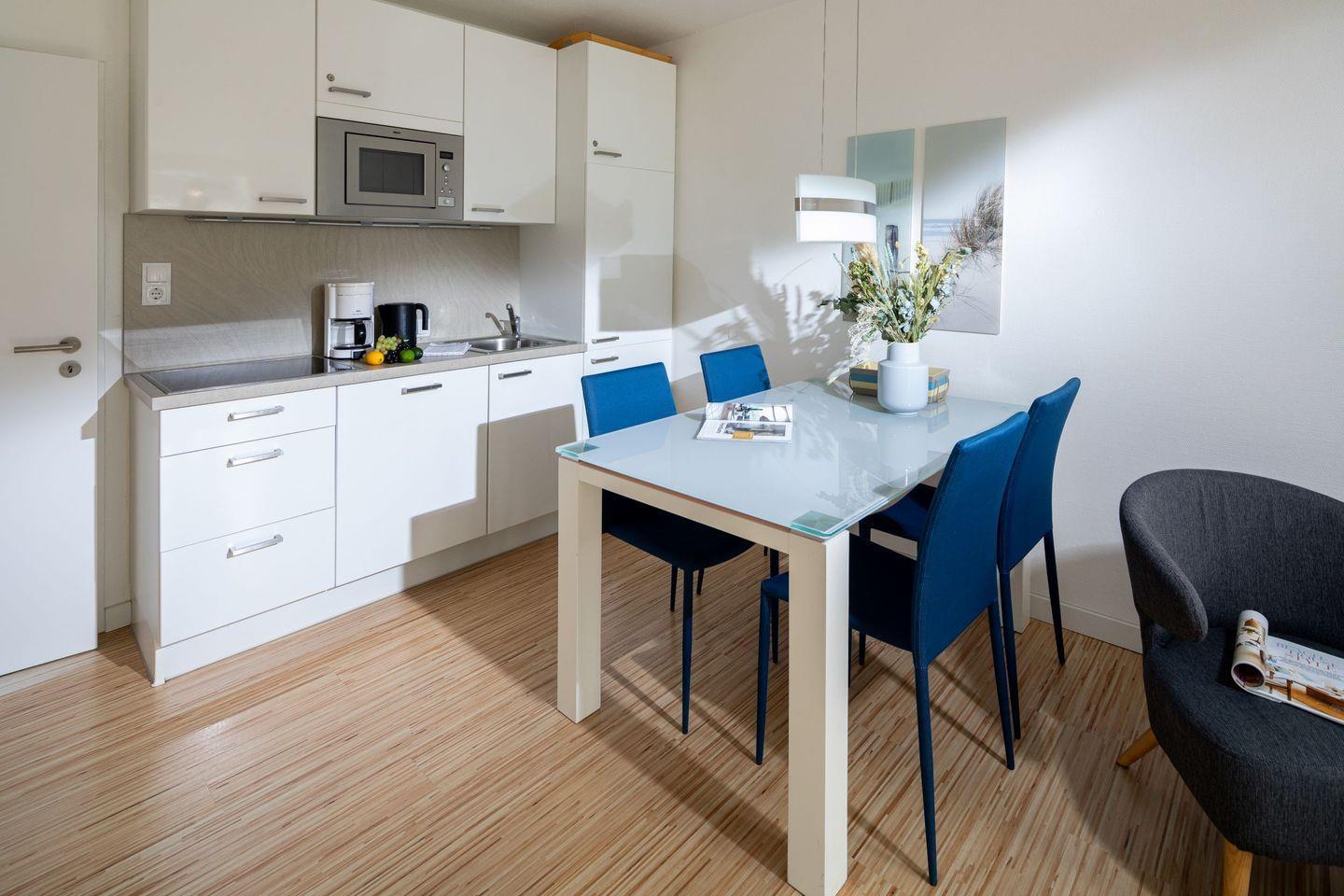 Die offen gestaltete Küchenzeile im Wohnbereich ist bestens ausgestattet: Kaffeemaschine, Wasserkocher, Toaster, Mikrowelle, Kochfeld, Kühlschrank und Geschirrspülmaschine lassen keine Wünsche offen.