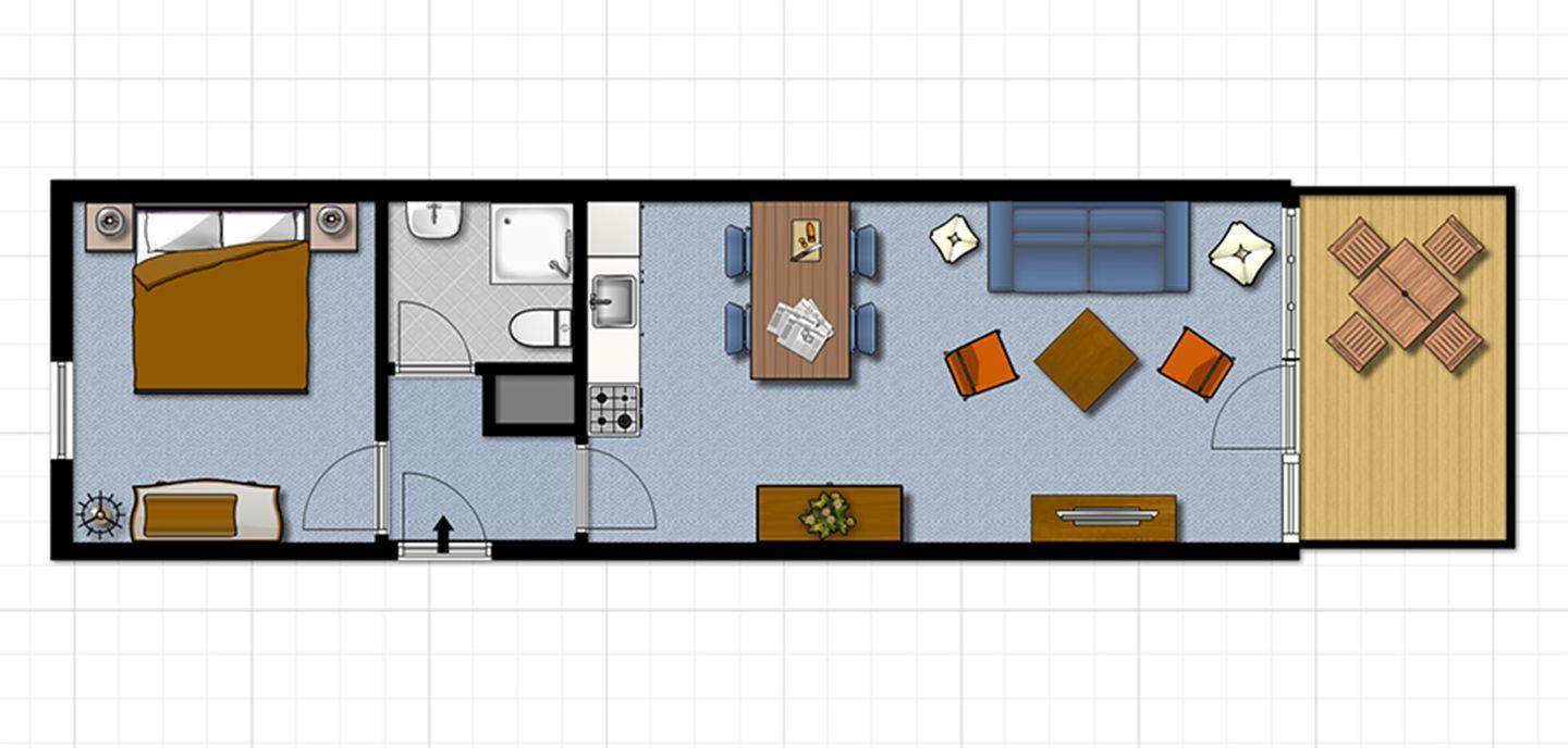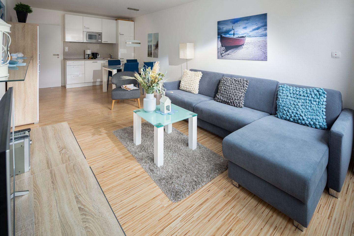 Der helle Wohnbereich lädt mit einem gemütlichen Schlafsofa zum Verweilen ein. Für Unterhaltung sorgen ein Smart-TV sowie eine Stereoanlage. Eine große Fensterfront sorgt für angenehmes Tageslicht und schafft eine einladende Atmosphäre.