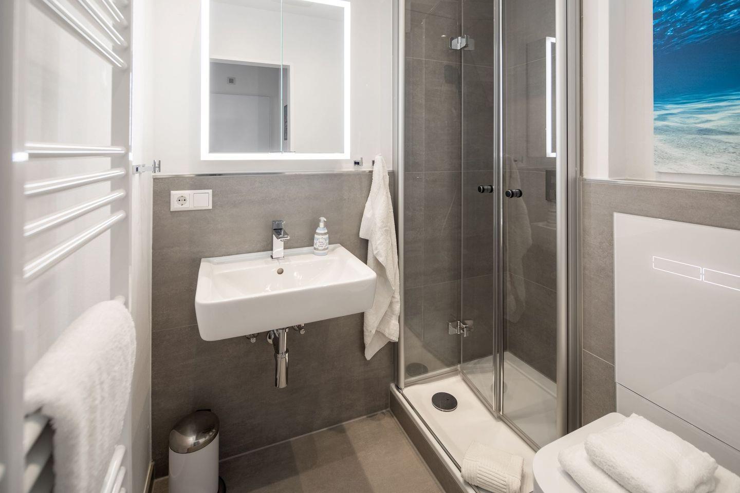 Das moderne Badezimmer ist mit Dusche und WC ausgestattet.